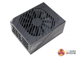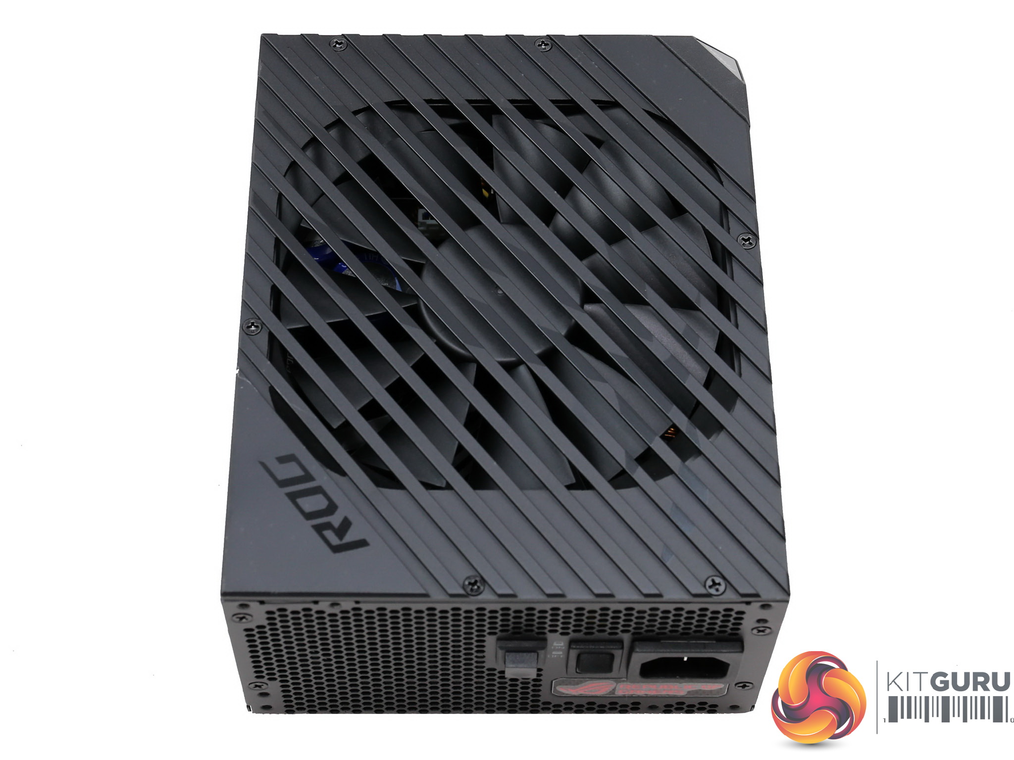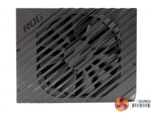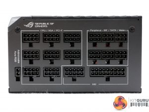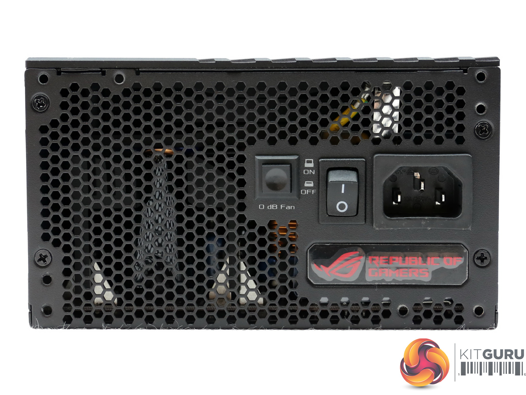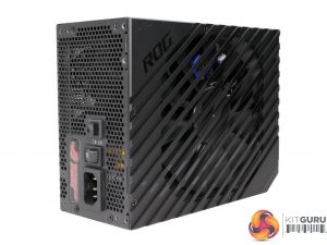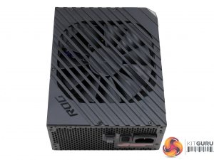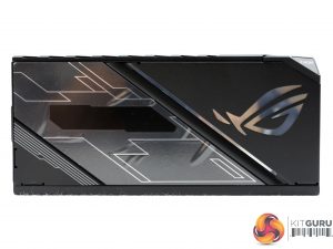 The external design is nice and on top of that it is distinctive. We didn't expect a plain design from a ROG product. The only common part in this power supply is the front exhaust grille, which uses the typical honeycomb-design. Besides the power switch we also find a push button, for toggling on/off the semi-passive operation.