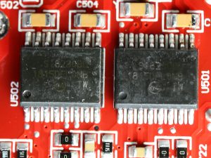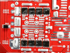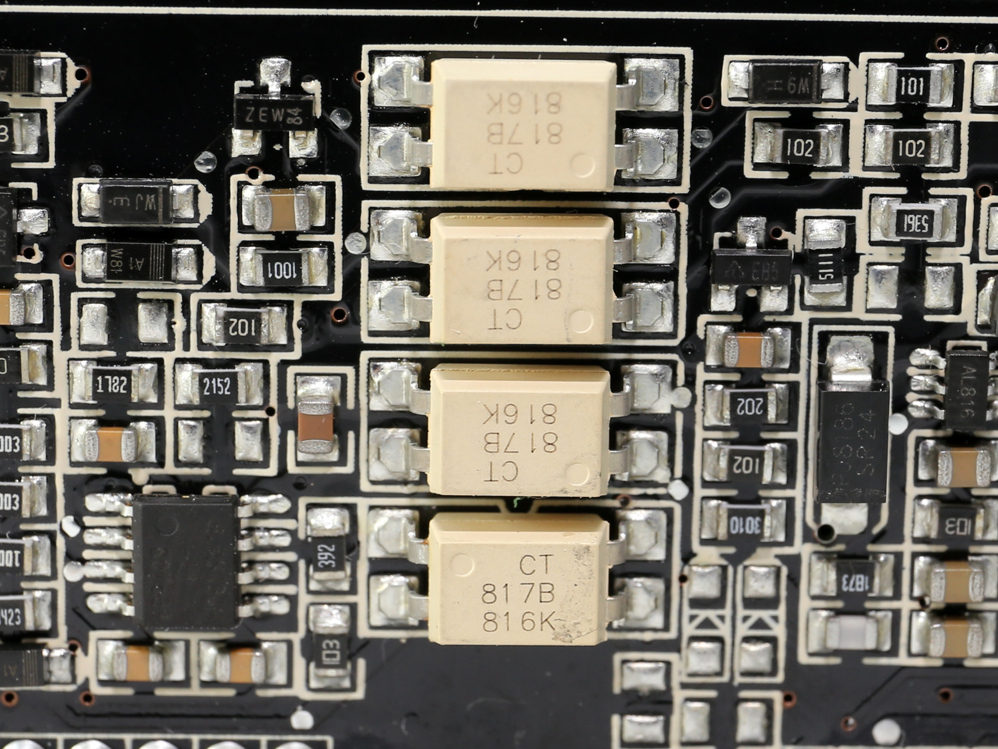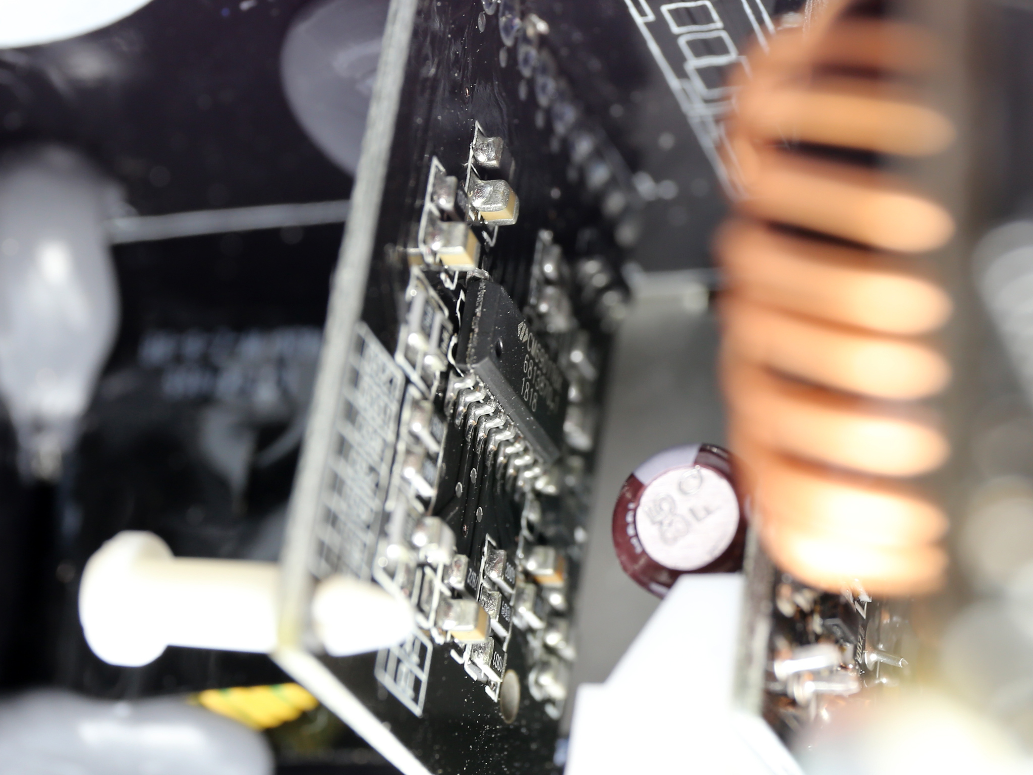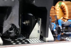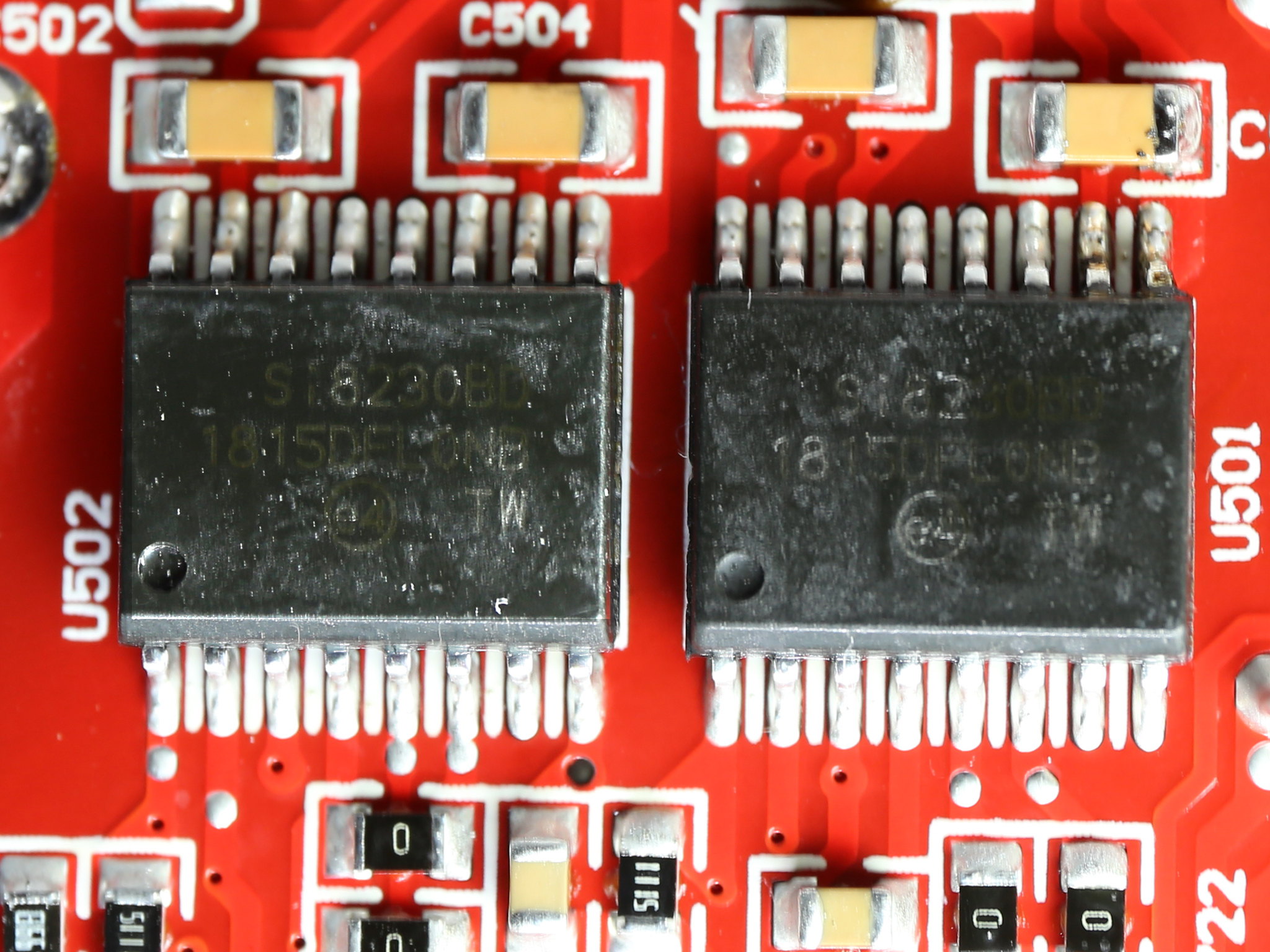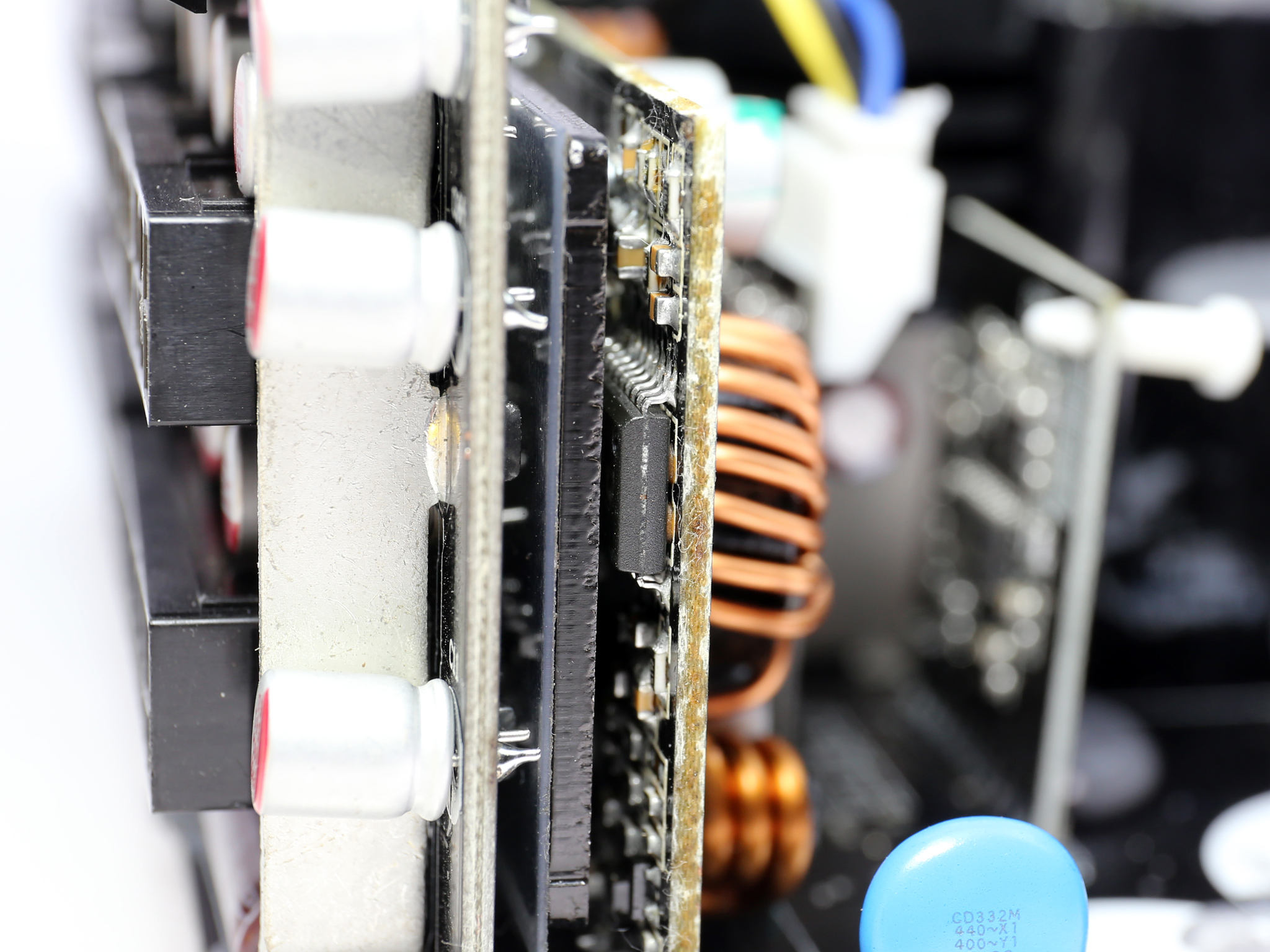The latter is hosted on a vertical-board which is right behind the fan control board. Finally, the driver ICs of the main switching FETs are a pair of Silicon Labs Si8230BD.