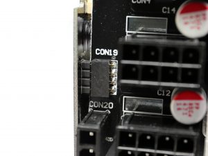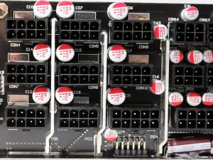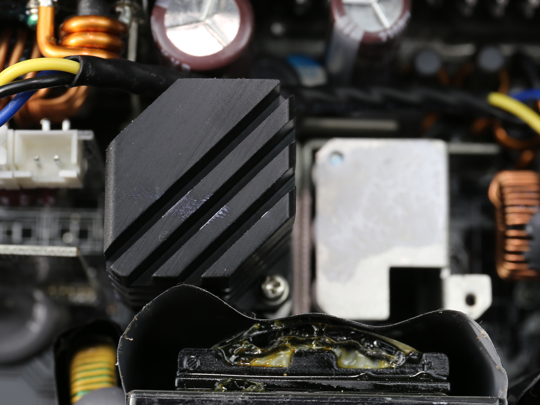 The +12V rail is rectified by eight Nexperia PSMN1R0-40YLD FETs, installed at the solder side of the board. There are two heatsinks right above them, on the business side of the PCB, which assist in their cooling.