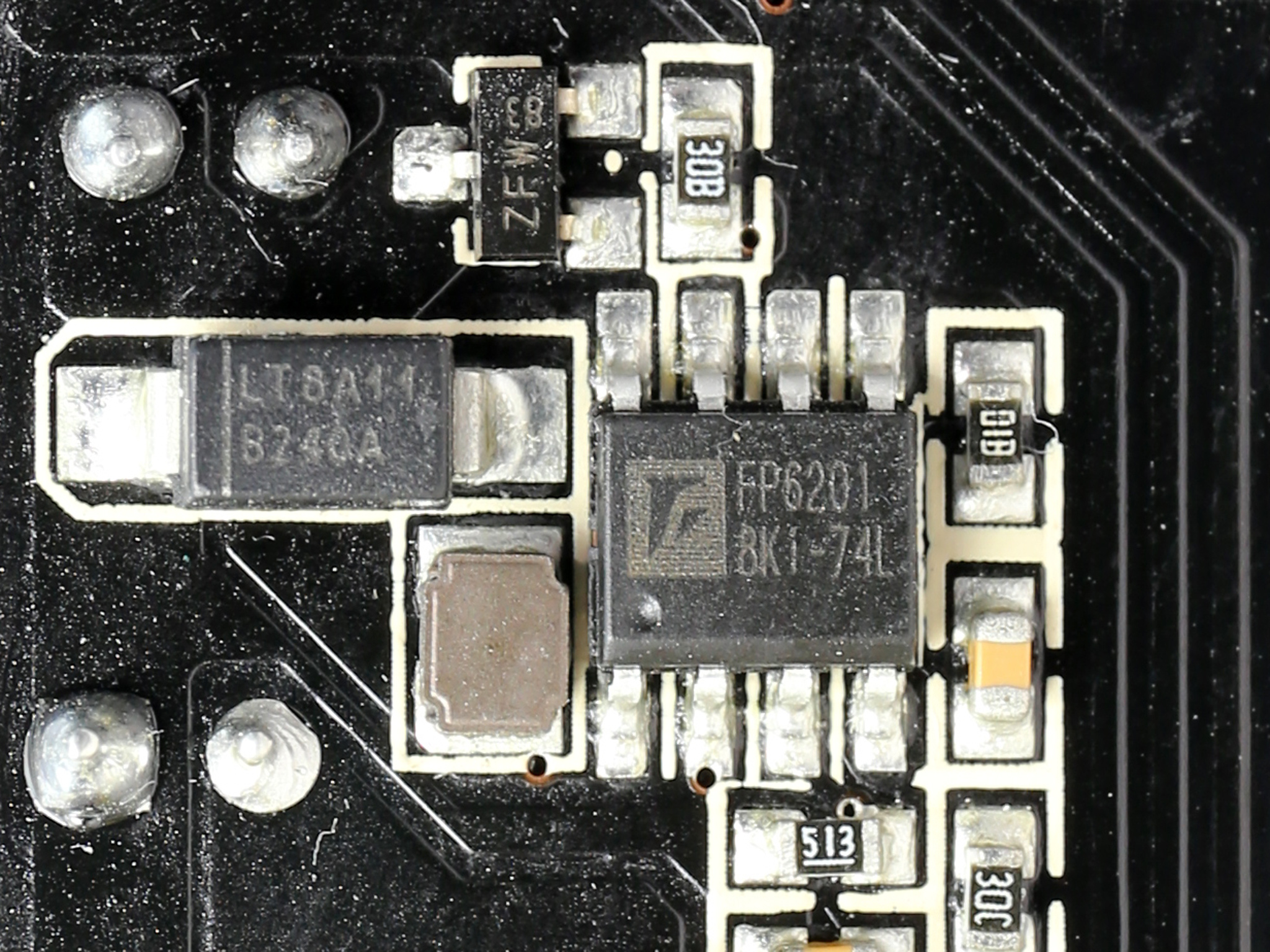 We also found a FP6201 switching boost regulator on this board, along with a LT8A diode. Those two parts are most likely used to provide power to the PSU's OLED screen and/or some of the RGB lighting.