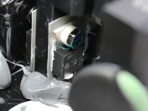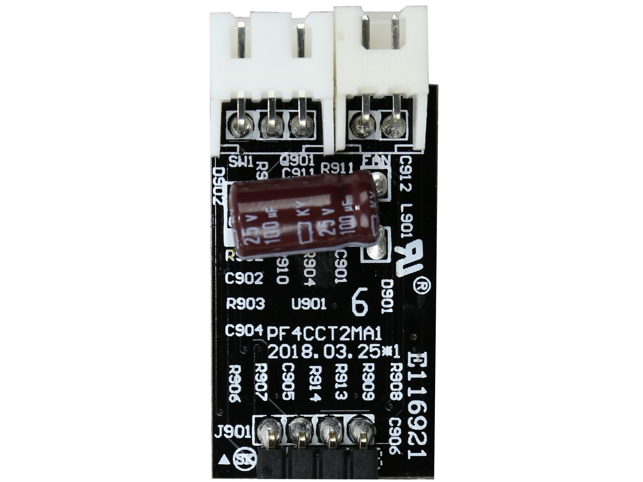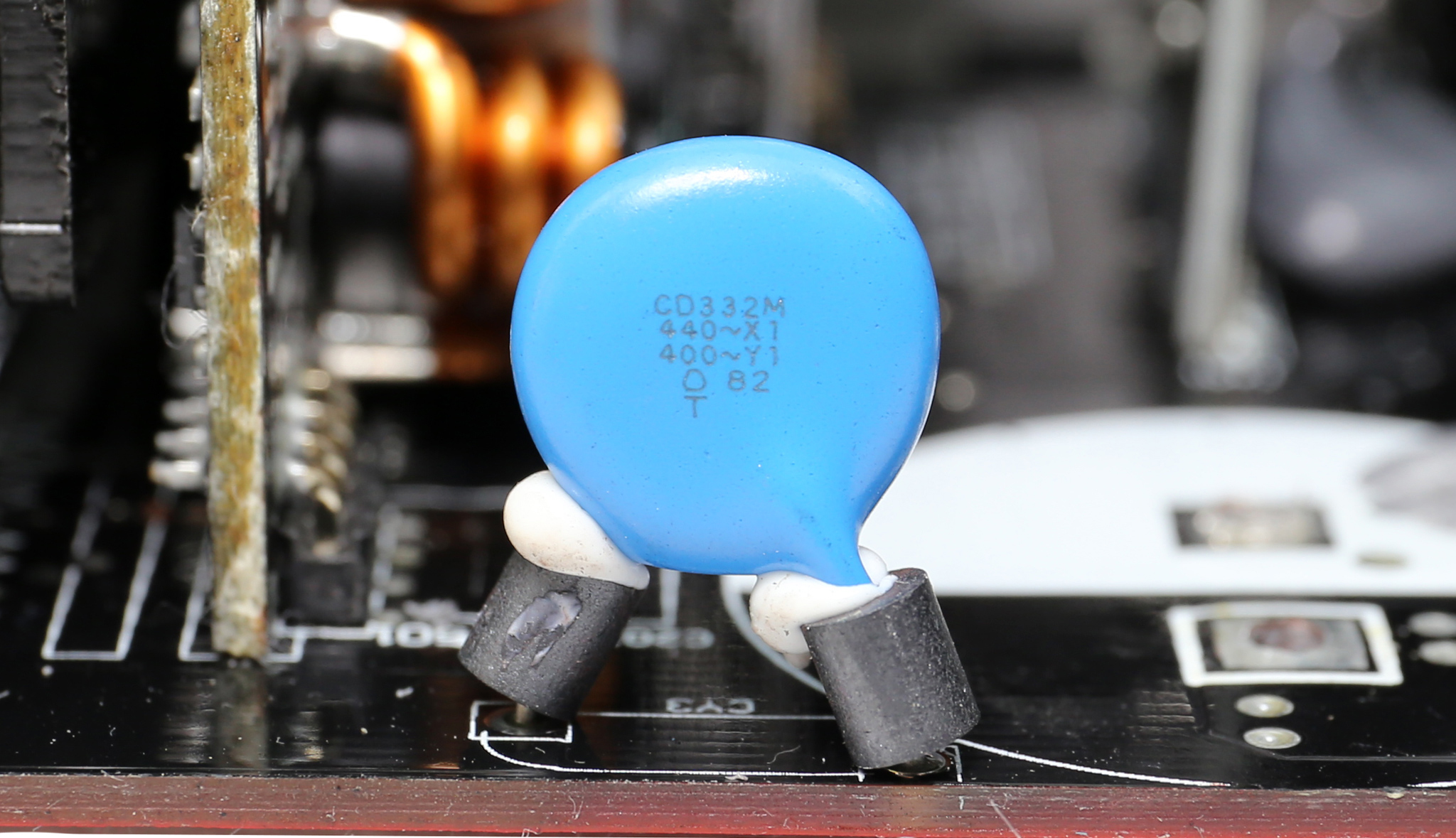 The first part of the transient filter is at the AC receptacle, as usual. It includes two X and two Y caps. It continues on the main PCB with a single X and two Y caps. The second X cap shown in the photos belongs to the LLC resonant converter. There is also a MOV responsible for protection against surges coming from the mains grid.