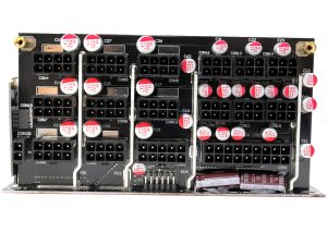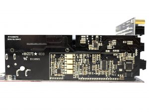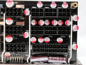 At the front side of the modular PCB a large number of polymer caps along with a pair of electrolytic Chemi-Cons (KY series) are used for ripple filtering purposes.
