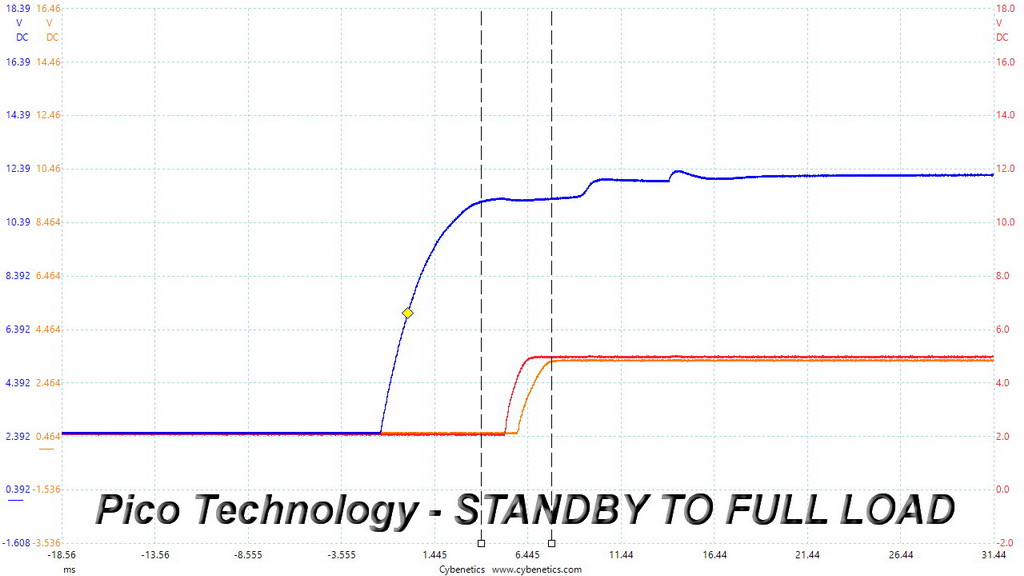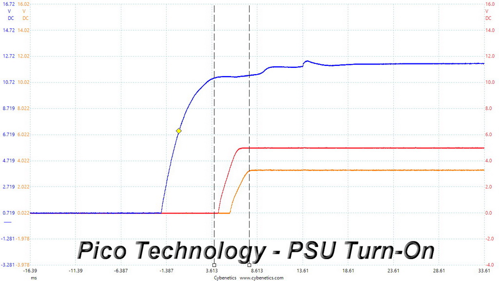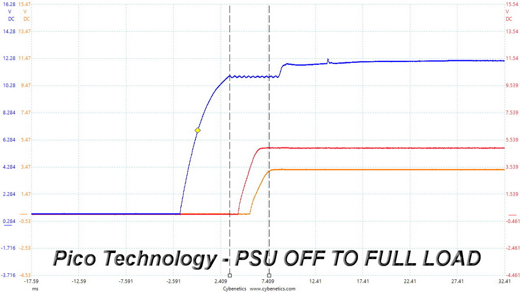 According to Intel’s most recent Power Supply Design Guide (revision 1.4) the +12V and 5V voltages must be equal or greater than the 3.3V rail’s output at all times, during the power-up and normal operation. For our first measurement, we turn the unit off and switch it back on without any load in any of the rails.