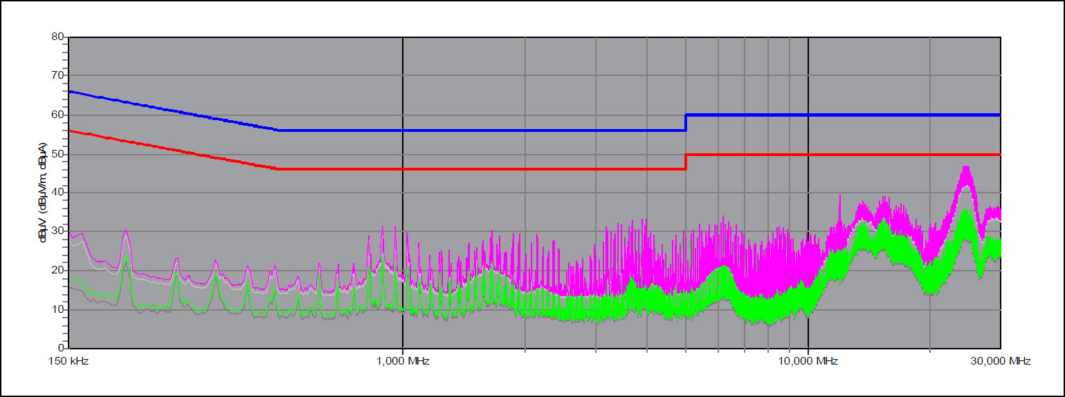 Low conducted EMI emissions through out the entire frequency range. The EMI filter does a splendid job!