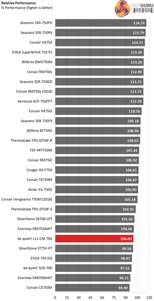 The overall performance is not high, with the SSR-750FX and the BWG750M being way ahead. Even the Corsair Vengeance 750M, which has similar specs, achieves a notably higher score.