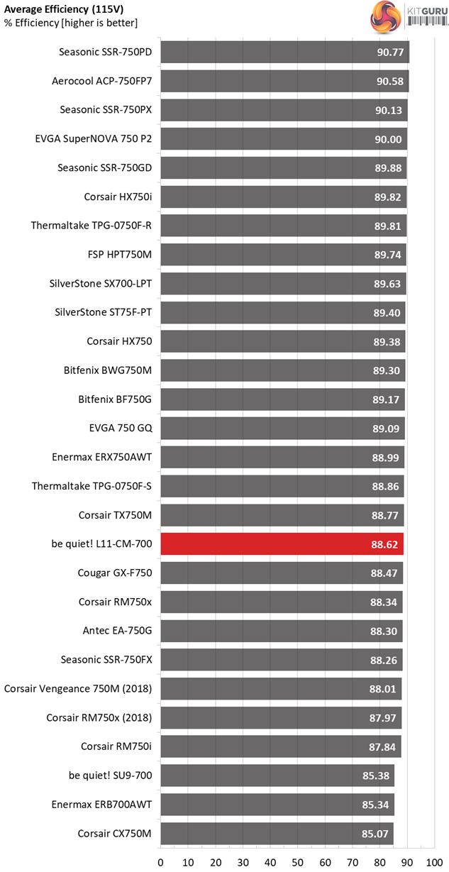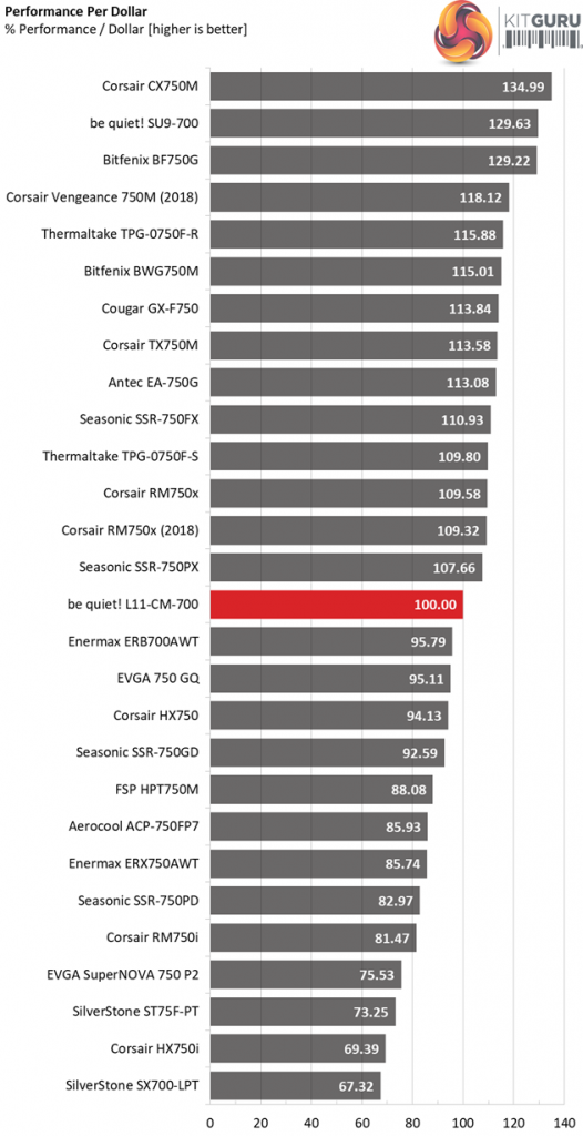 With a close to 100 dollars price tag the performance per buck is not so competitive. With the same amount someone can get a Seasonic Focus Plus Gold 750W or the similar capacity Bitfenix Whisper M, with both units offering higher performance and a longer warranty.