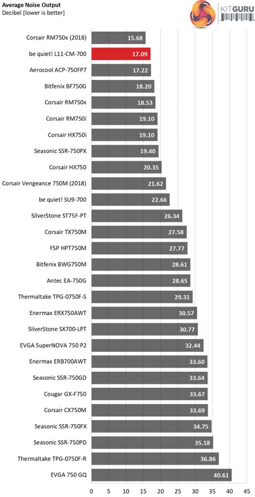 When it comes to noise output, the L11-CM-700 honors its brand's name since it is super quiet. Only the, more expensive, Corsair RM750x (2018) manages to outperform it in this section.