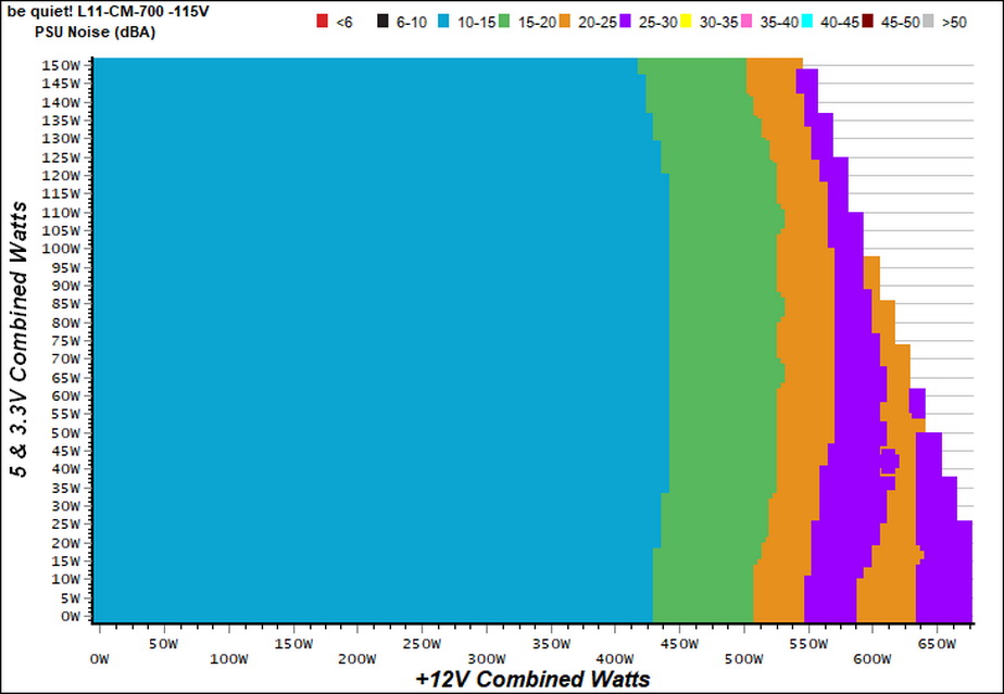 The PSU's noise is low, throughout its entire operation range. Up to 440W the acoustics noise is within the 10-15 dB(A) range, while in the worst case scenario we measure less than 30 dB(A).