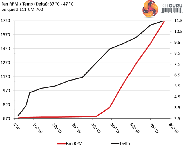 The first chart below illustrates the cooling fan's speed (in RPM), and the delta between input and output temperature. The results were obtained at 37°C (98.6°F) to 47°C (116.6°F) ambient temperature.