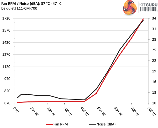 The next chart shows the cooling fan's speed (again, in RPM) and output noise. We measure acoustics from one meter away, inside a hemi-anechoic chamber. Background noise inside the chamber is below 6 dB(A) during testing (it's actually much lower, but our sound meter’s microphone hits its floor), and the results are obtained with the PSU operating at 37°C (98.6°F) to 47°C (116.6°F) ambient temperature.