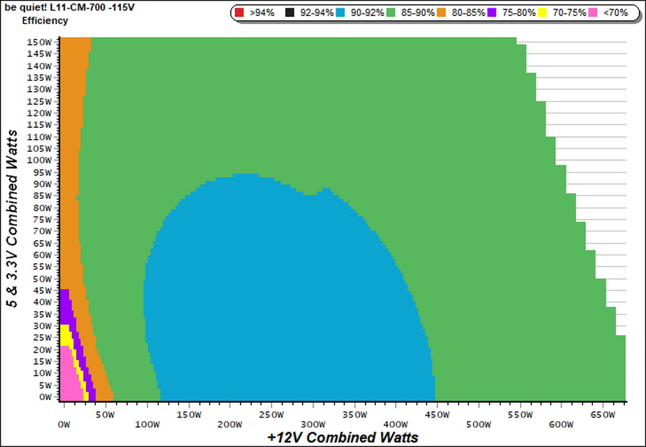 The high efficiency region is from 120W to around 450W at +12V, with the load on the minor rails staying below 95W. In the majority of its operating range the unit delivers within 85-90% efficiency.