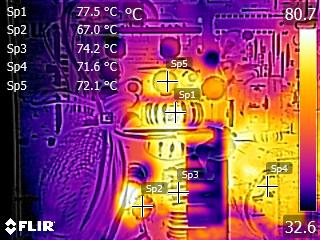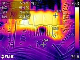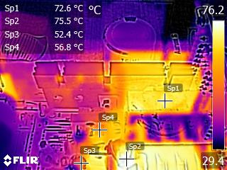 We apply half-load for 10 minutes with the PSU’s top cover and cooling fan removed before taking photos with our modified FLIR E4 camera that delivers 320×240 IR resolution (76,800 pixels).