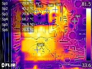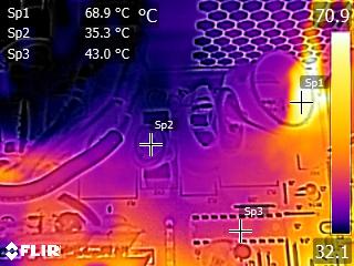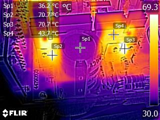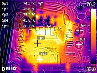 The caps close to the chokes of the secondary side get quite hot, and this can be a problem since they belong to Teapo's mainstream SC line. Other than that, we don't spot anything strange in those IR shots. The temperatures in the rest components are kept at normal levels, considering this platform's efficiency.