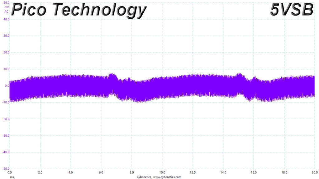 The following oscilloscope screenshots illustrate the AC ripple and noise registered on the main rails (+12V, 5V, 3.3V and 5VSB). The bigger the fluctuations on the screen, the bigger the ripple/noise. We set 0.01 V/Div (each vertical division/box equals 0.01V) as the standard for all measurements.