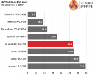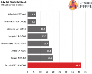 The +12V rail goes close to 45mV under full load at high ambient, which is a satisfactory result, however the minor rails, especially 3.3V, clearly need more filtering caps.