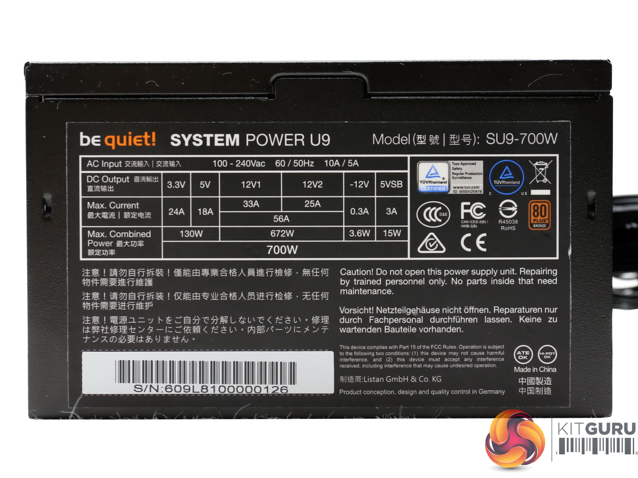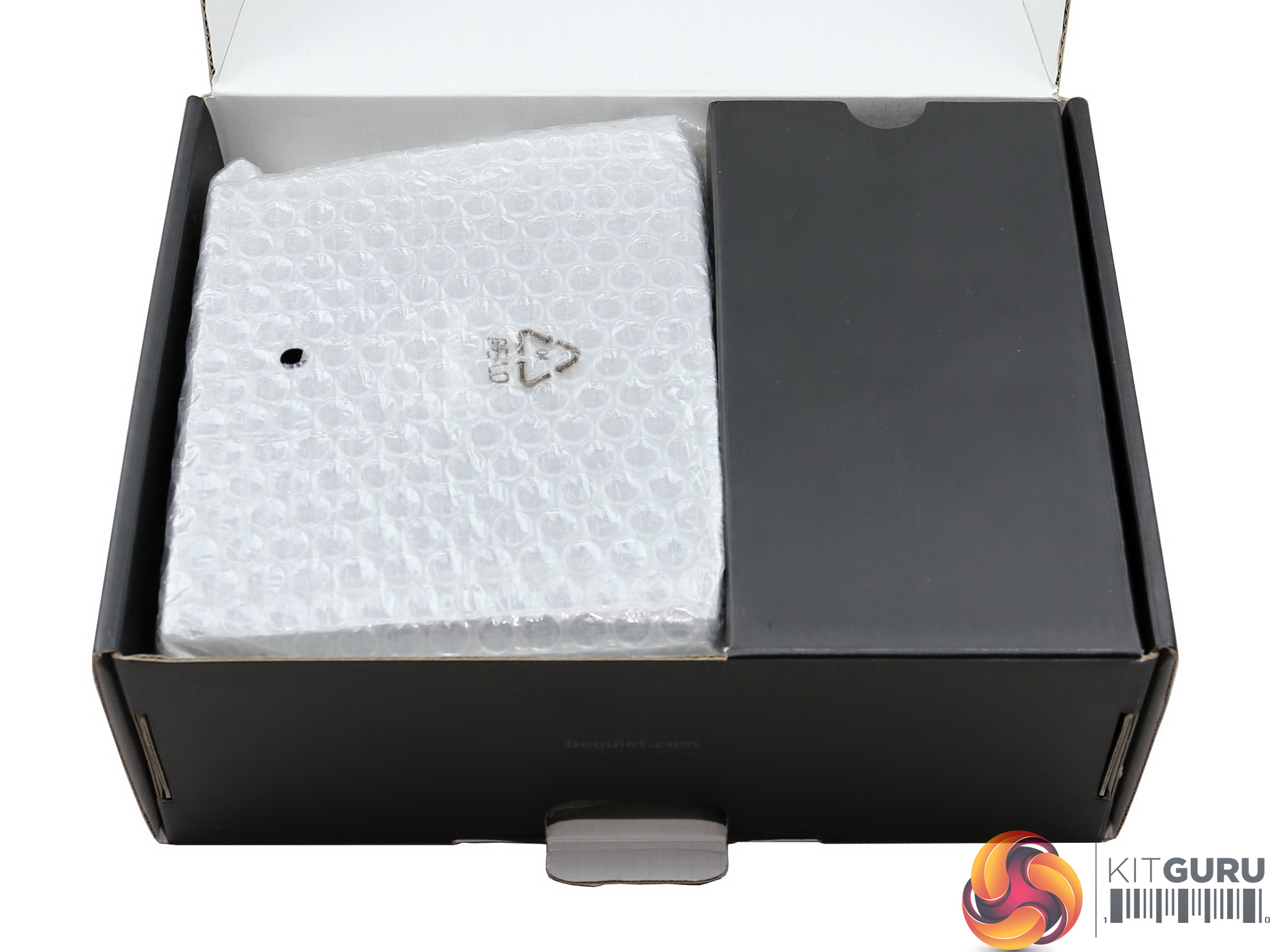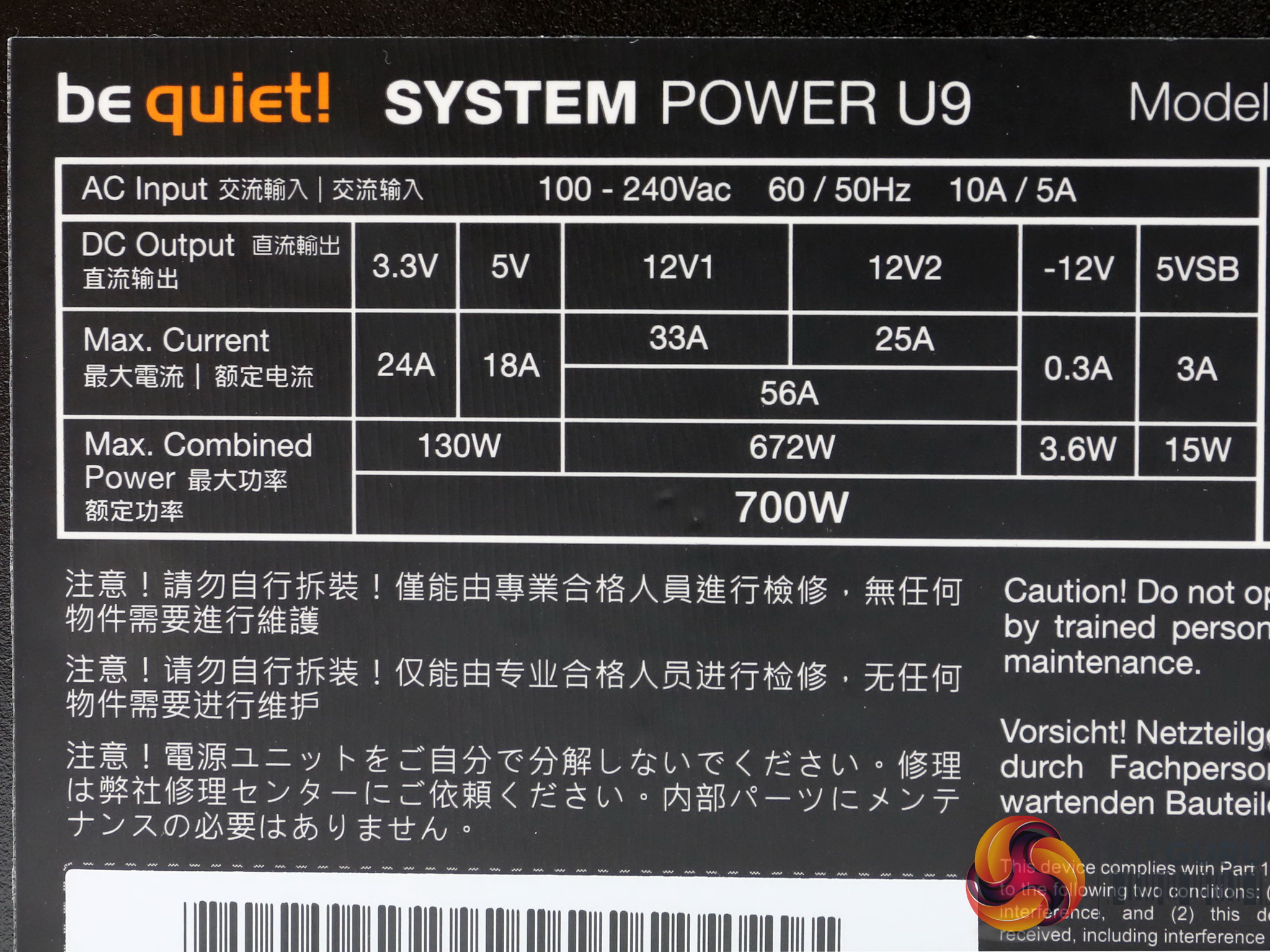 The be quiet! logo is stamped onto one of the sides, while on the other is a large power specifications label.