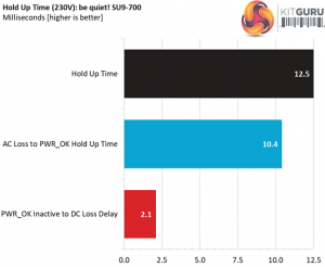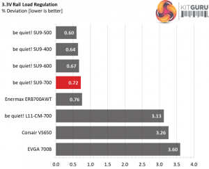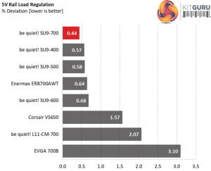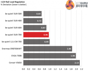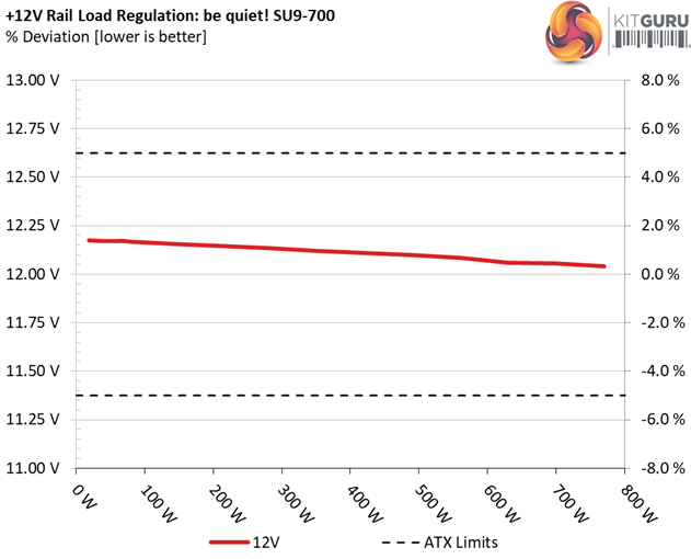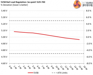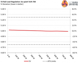 The first set of tests reveals the stability of the voltage rails and the SU9-700’s efficiency. The applied load equals (approximately) 10 to 110 percent of the power supplies maximum load in increments of 10 percentage points.