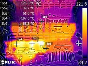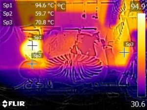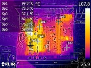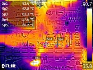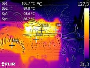 The temperatures on the DC-DC converters are high, because we stress those pretty hard with 12 Amperes of load on each of the minor rails. A resistor right behind the NTC thermistor also has high temperature, a clear indication that energy is lost on it.