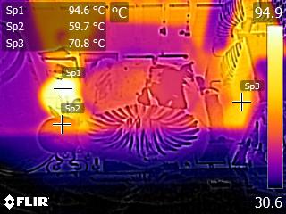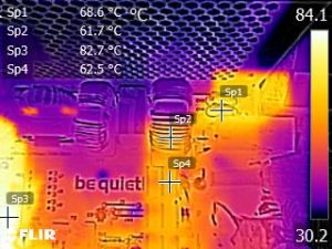 We apply half-load for 10 minutes with the PSU’s top cover and cooling fan removed before taking photos with our modified FLIR E4 camera that delivers 320×240 IR resolution (76,800 pixels).