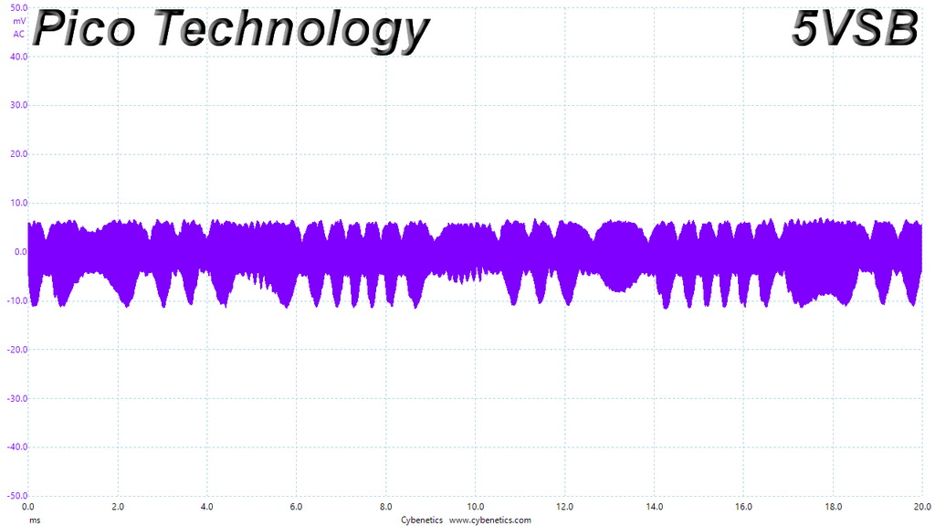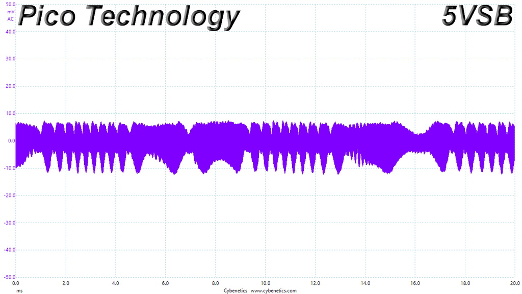 The following oscilloscope screenshots illustrate the AC ripple and noise registered on the main rails (+12V, 5V, 3.3V and 5VSB). The bigger the fluctuations on the screen, the bigger the ripple/noise. We set 0.01 V/Div (each vertical division/box equals 0.01V) as the standard for all measurements.