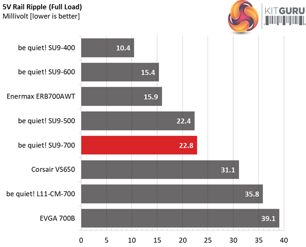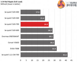 The following table includes the ripple levels we measured on the SU9-700’’s rails. The limits, according to the ATX specification, are 120mV (+12V) and 50mV (5V, 3.3V, and 5VSB).