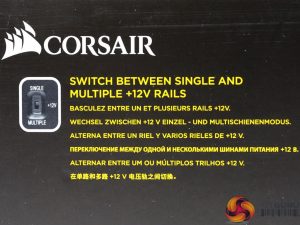 At the rear there is a switch for toggling the +12V rail mode on and off. From the factory the power supply comes configured in single +12V rail mode and we suggest to leave it this way.