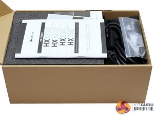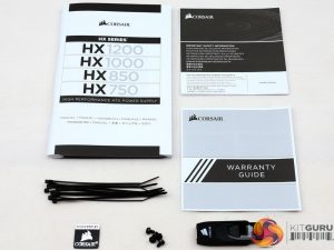 At the internals of the box the PSU is well protected by packing foam, and it is also installed into a nice bag. The bundle includes a user's manual which is common across all HX models, a warranty guide, several zip ties, a set of fixing bolts and a case badge.