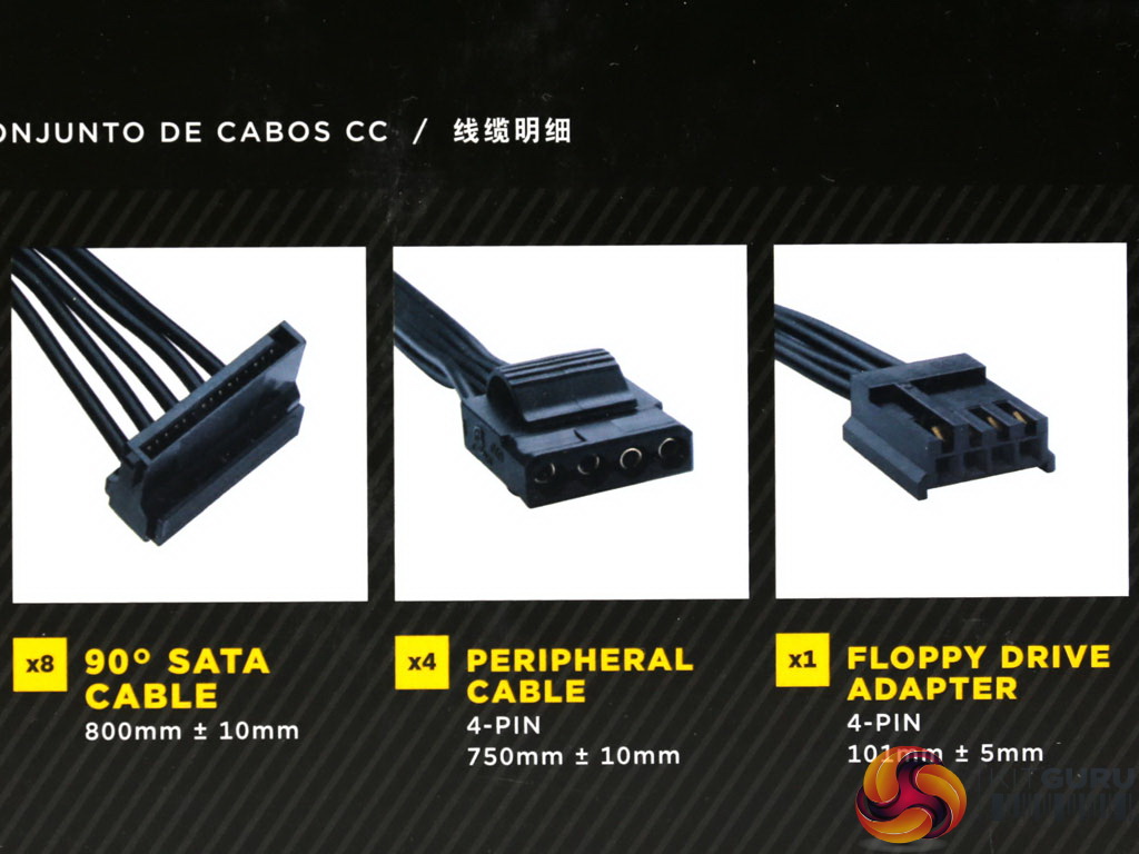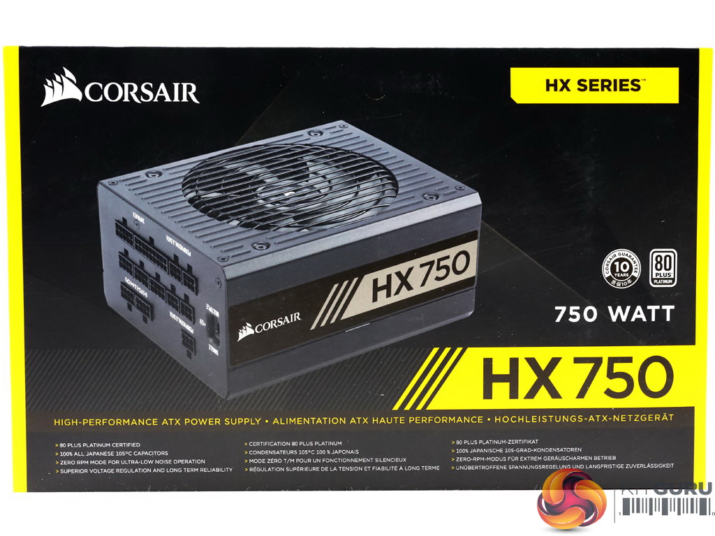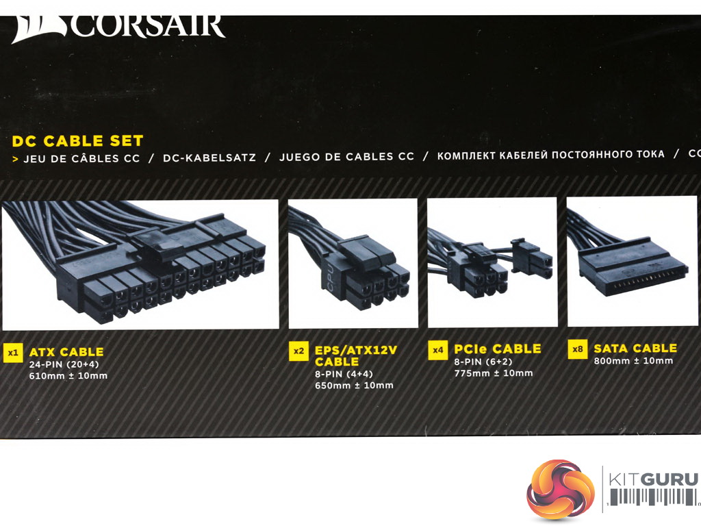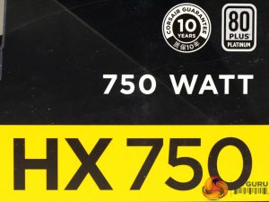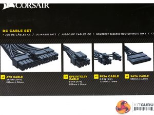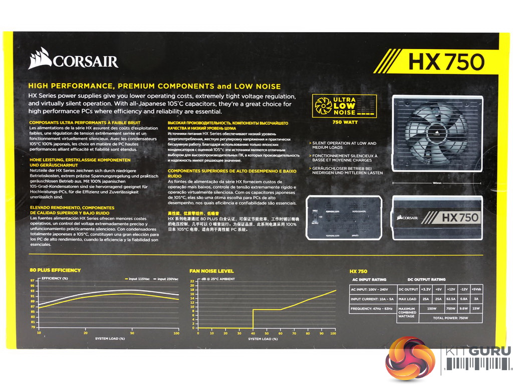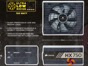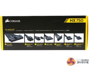 Around the back you will find the power specifications table and a scheme showing the HX750's dimensions. Finally, at the top side of the box Corsair provides a list with the available connectors and the cable length.