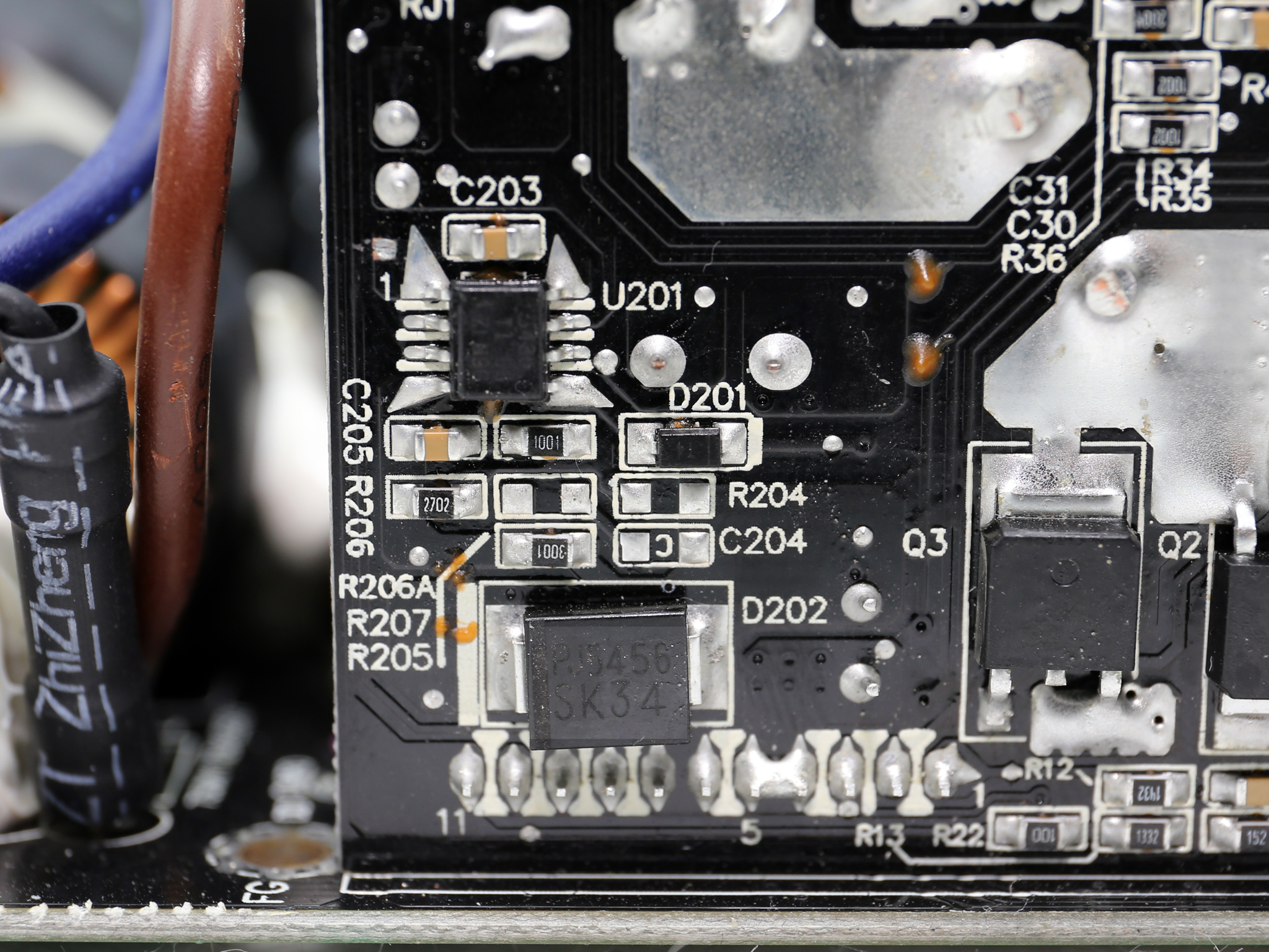 The 5VSB rail is regulated by a ISD04N65A FET and a MBRU2045CT SBR (Schottky Barrier Diode). We also found a QM3004D FET on the modular board which is probably also utilized by this rail. Lastly, the standby PWM controller is an On-Bright OB5269CP.