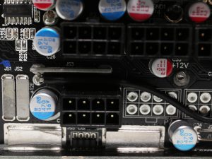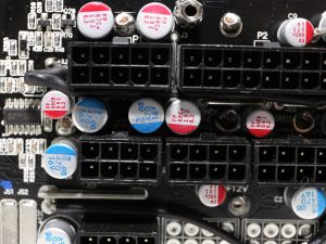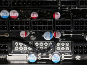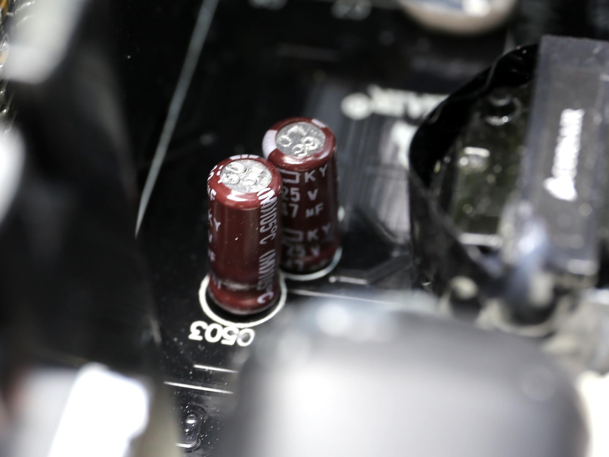 The electrolytic filtering caps are provided by Chemi-Con and belong to the company's KZE and KY lines. A number of polymer caps is also used for ripple filtering. Those ones are by Chemi-Con and FPCAP, so they are of high quality.