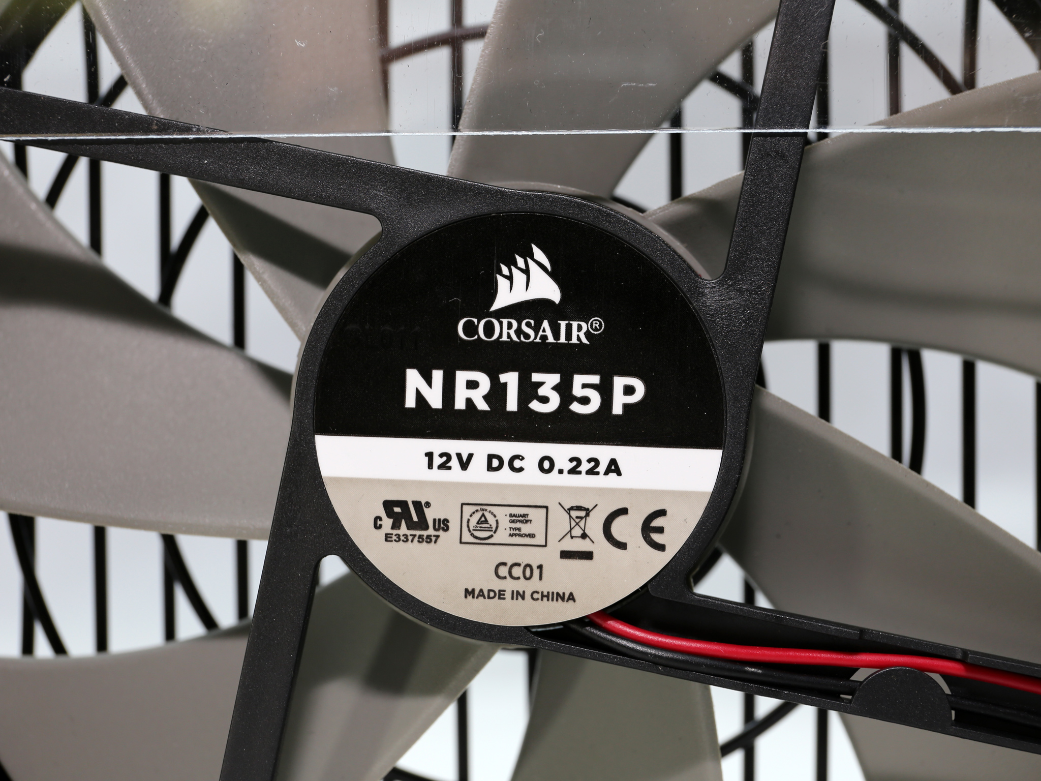 The NR1350P (135mm, 12V, 0.22A) fan model is the omnipresent in Corsair's high-end models. It uses a true fluid dynamic bearing and thanks to the highly relaxed fan profile and the semi-passive operation, it won't bother you with loud operating noise even under tough conditions.