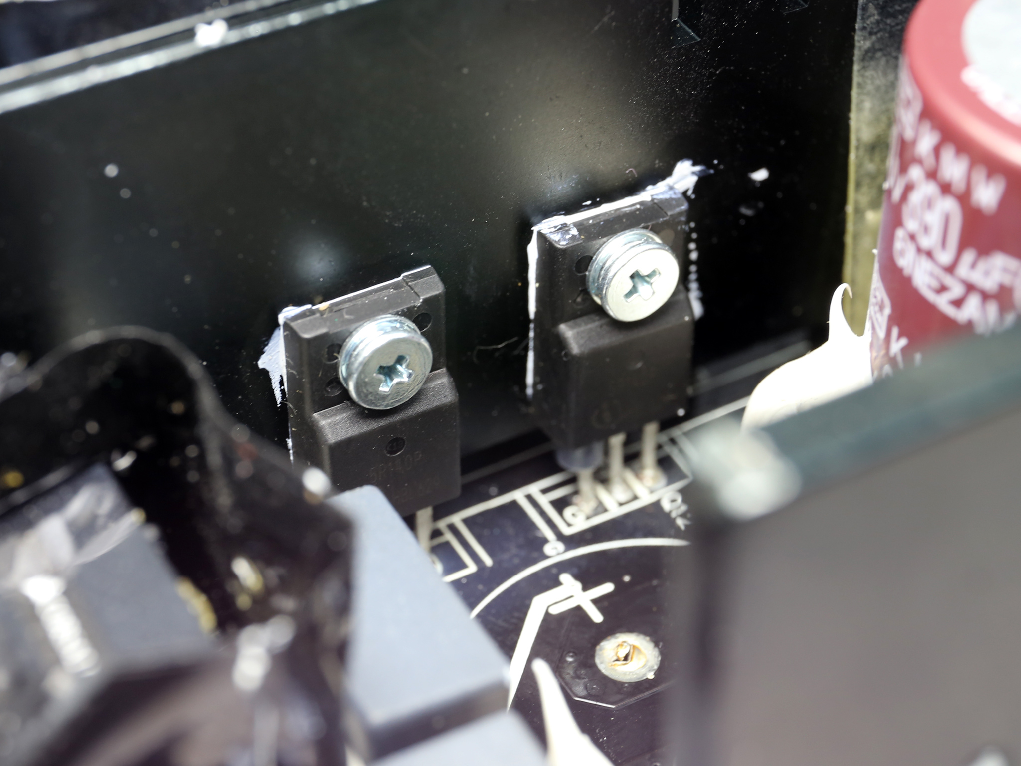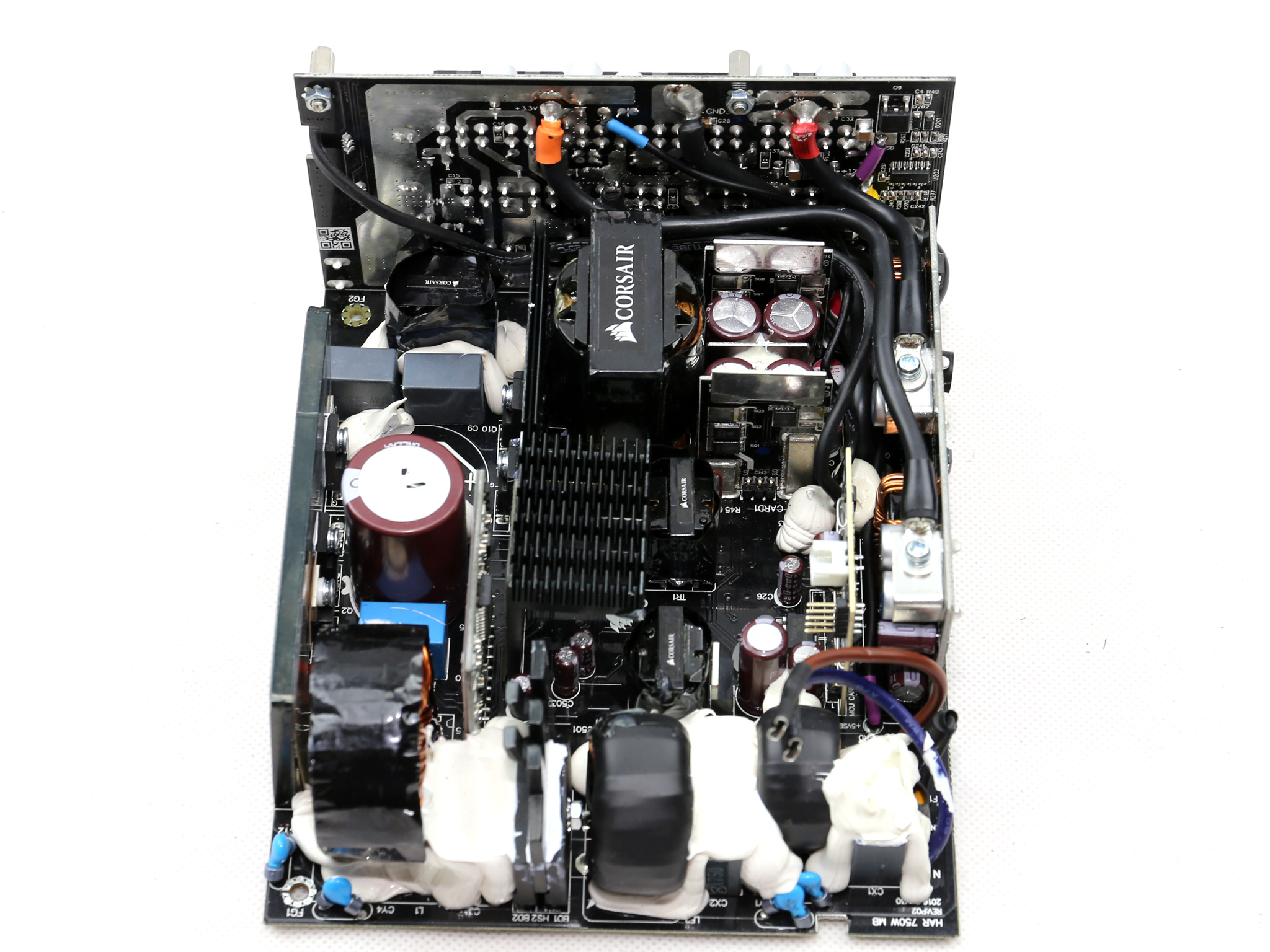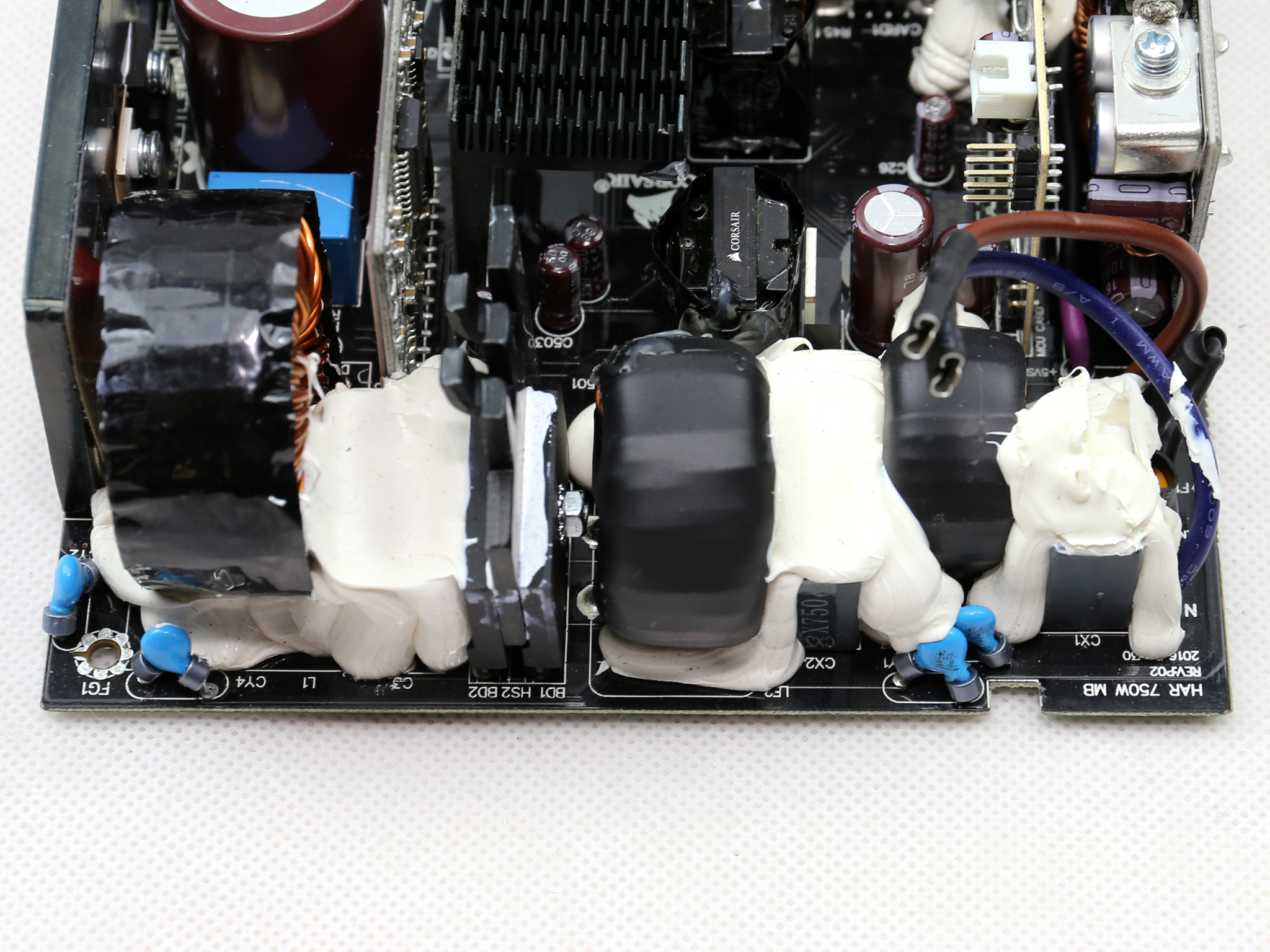 Two bridge rectifiers are used. One of them is totally covered by the while glue that CWT uses in order to avoid coil whine issues and also to secure the PSU's part in place, even under extreme shipping or usage conditions. The HX850 uses two Vishay LVB2560 here.