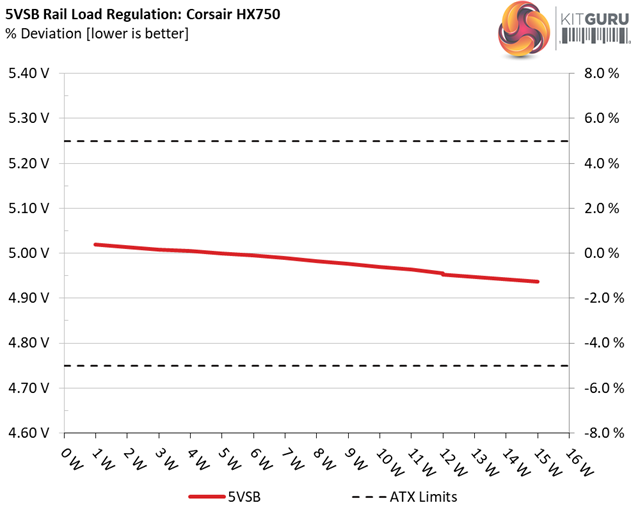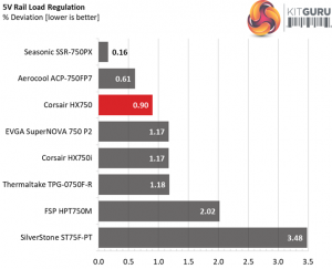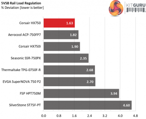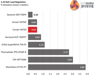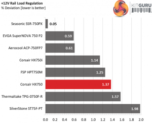 The load regulation at +12V is not the best we have seen, however it isn't bad either. On the minor rails the voltage deviations are lower. When it comes to noise output, the HX750 excels even under tough conditions. Up to the 50% load test the fan remains deactivated and even during the overload test with 110% load, the PSU remains silent enough since it barely exceeds 31 dB(A) noise. Corsair/CWT used a highly relaxed fan profile since this is a highly efficient platform, so the thermal loads are kept load hence there is no need for increased airflow.