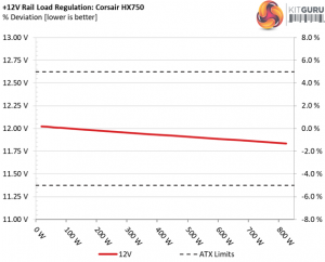 The first set of tests reveals the stability of the voltage rails and the HX750’s efficiency. The applied load equals (approximately) 10 to 110 percent of the power supplies maximum load in increments of 10 percentage points.