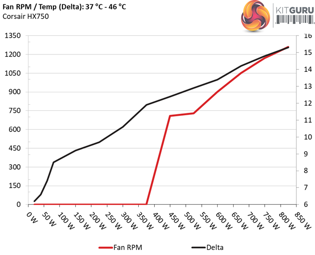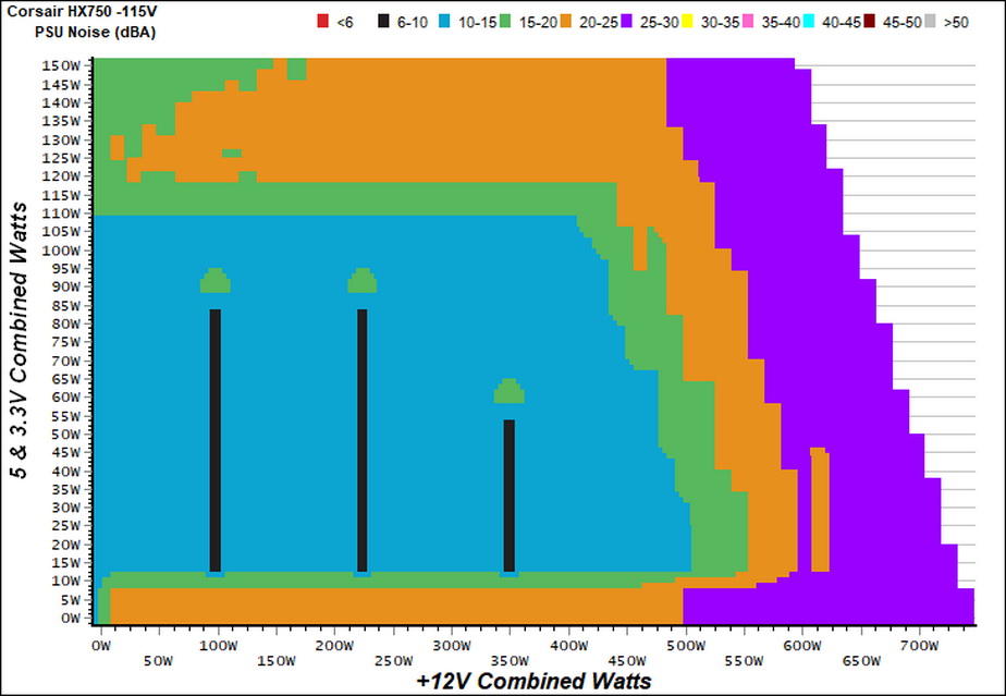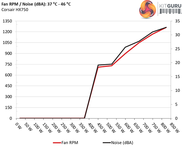 The next chart shows the cooling fan's speed (again, in RPM) and output noise. We measure acoustics from one meter away, inside a hemi-anechoic chamber. Background noise inside the chamber is below 6 dB(A) during testing (it's actually much lower, but our sound meter’s microphone hits its floor), and the results are obtained with the PSU operating at 37°C (98.6°F) to 46°C (114.8°F) ambient temperature.