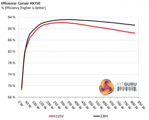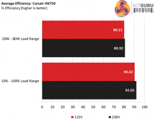 Using results from the previous page, we plotted a chart showing the HX750’s efficiency at low loads, and loads from 10 to 110 percent of its maximum-rated capacity.