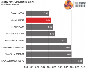 In the table below, you'll find the power consumption and voltage values of all rails (except -12V) when the PSU is idle (powered on, but without any load on its rails), and the power consumption when the PSU is in standby mode (without any load, at 5VSB).