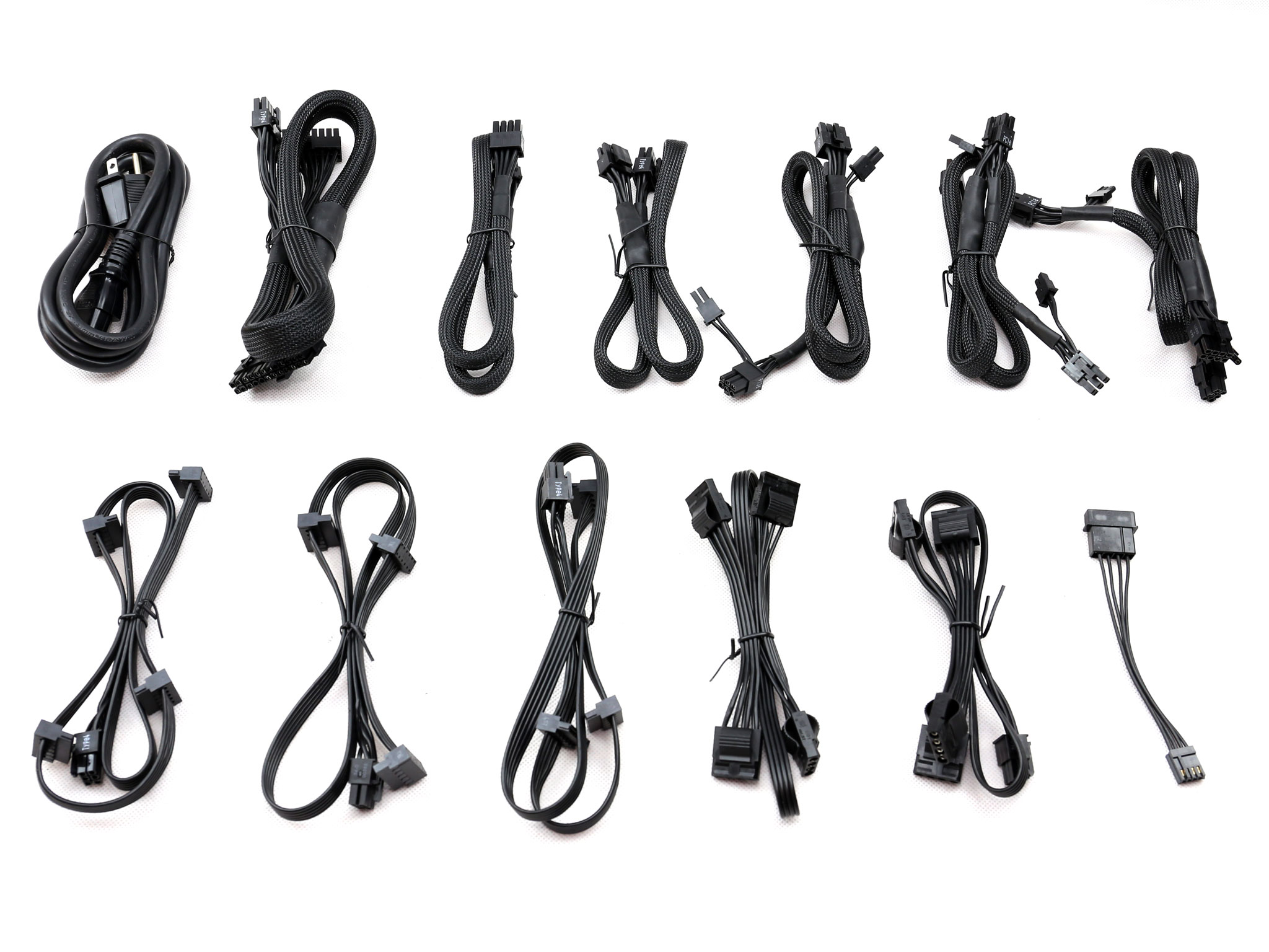There are two EPS connectors, something that we find essential in a 850W power supply. The number of PCIe connectors is satisfactory as well and the same goes for the SATA and 4-pin Molex. Corsair also provides a Berg (FDD) adapter for the users that still need it.