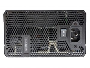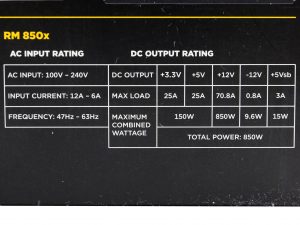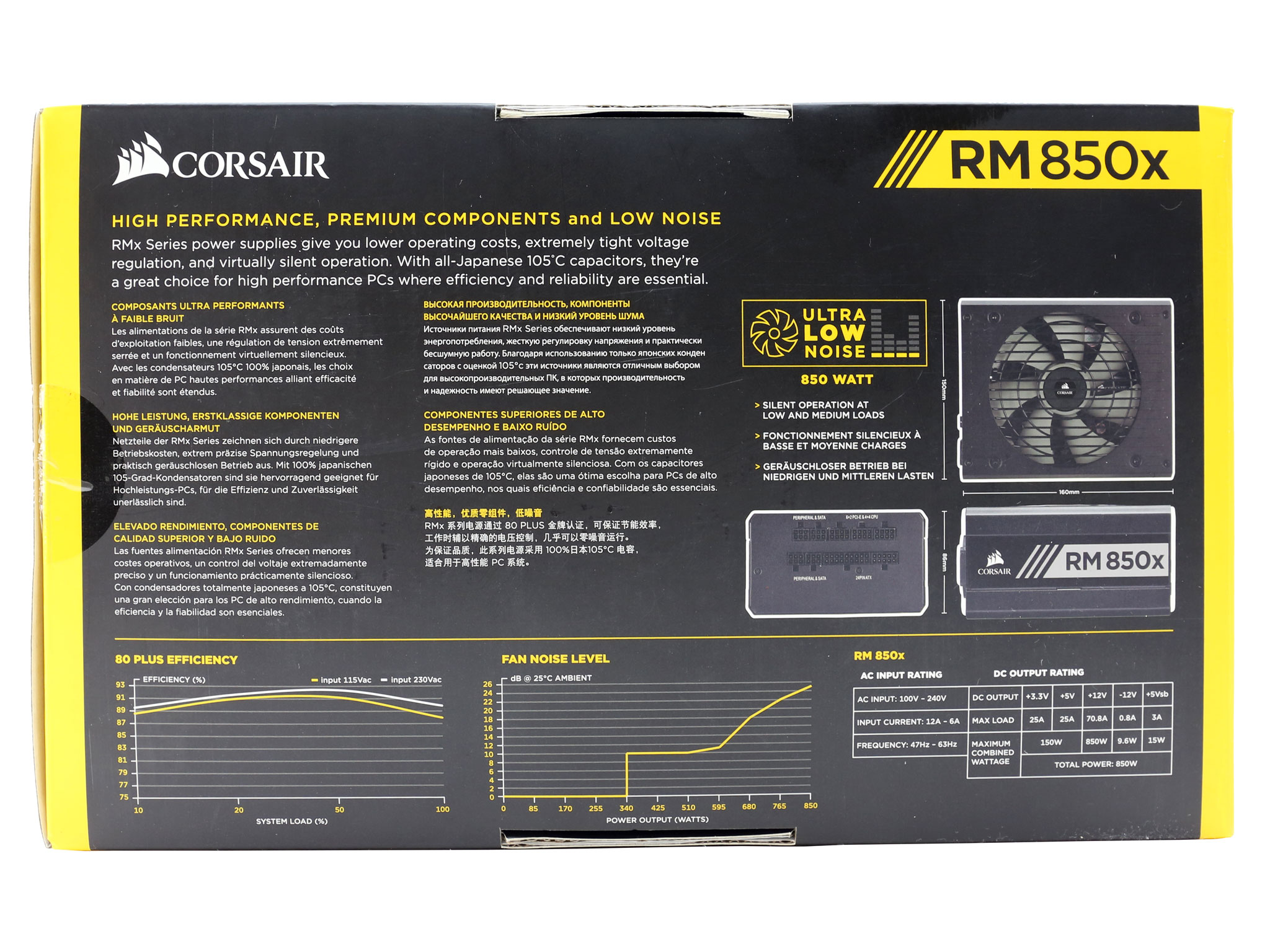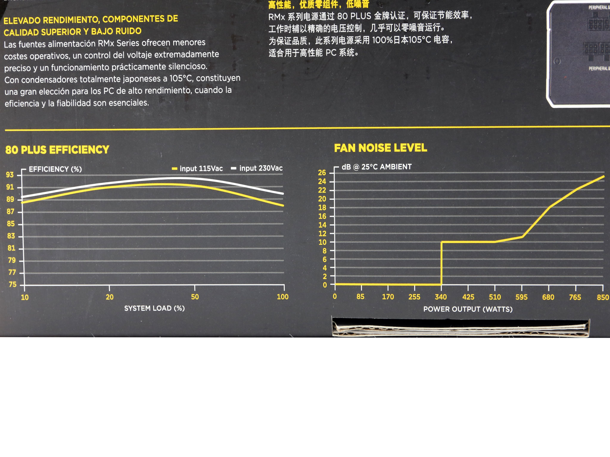 Around the back Corsair provides the unit's dimensions, its most important features and two charts showing the efficiency and fan's noise curves.