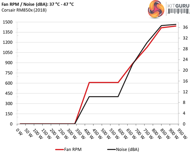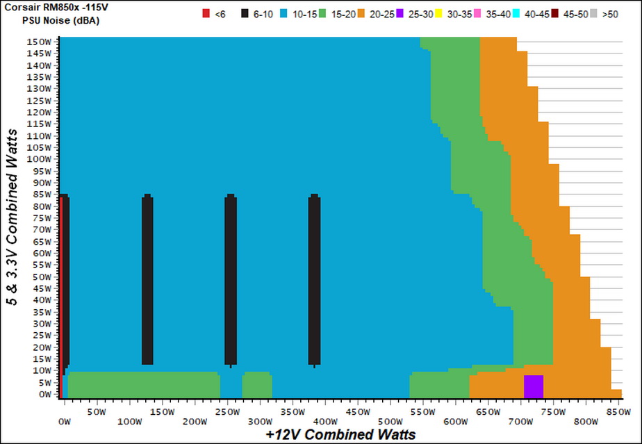 The next chart shows the cooling fan's speed (again, in RPM) and output noise. We measure acoustics from one meter away, inside a hemi-anechoic chamber. Background noise inside the chamber is below 6 dB(A) during testing (it's actually much lower, but our sound meter’s microphone hits its floor), and the results are obtained with the PSU operating at 37°C (98.6°F) to 47°C (116.6°F) ambient temperature.