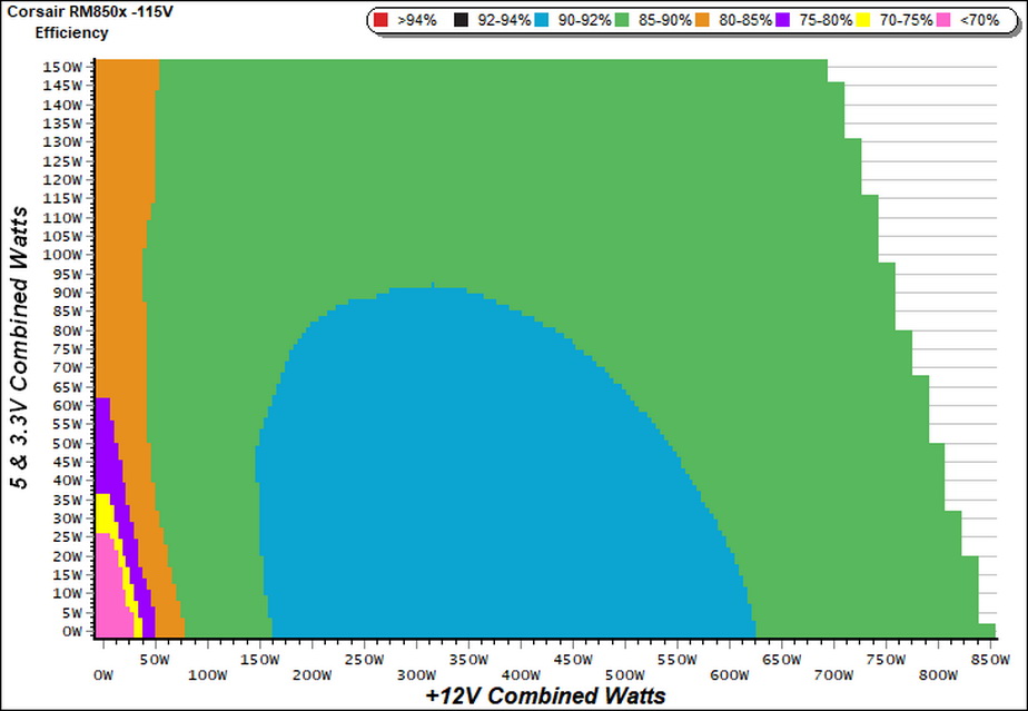 There is no region with efficiency exceeding 92%, however the 90-92% region is quite large. If the combined load on the minor rails was 100-120W, the unit's overall efficiency would be notably higher.There is no need anymore for so strong minor rails, after all.