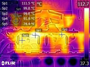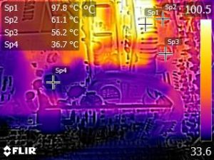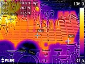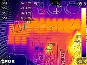 We apply half-load for 10 minutes with the PSU’s top cover and cooling fan removed before taking photos with our modified FLIR E4 camera that delivers 320×240 IR resolution (76,800 pixels).