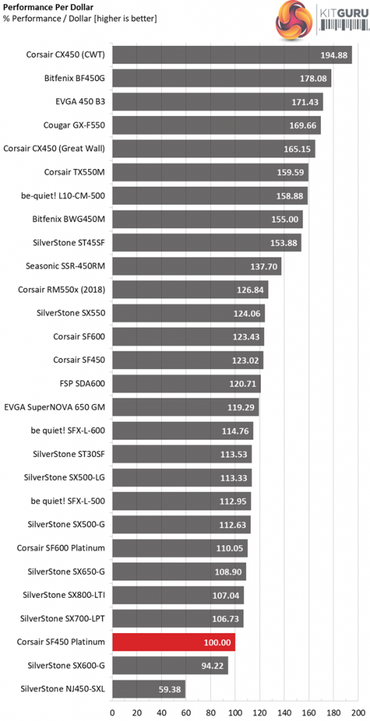 The Gold SF450 achieves a notably higher performance per buck score, thanks to its lower price tag. If you want top-notch efficiency though, then the Platinum model is definitely the one to get.