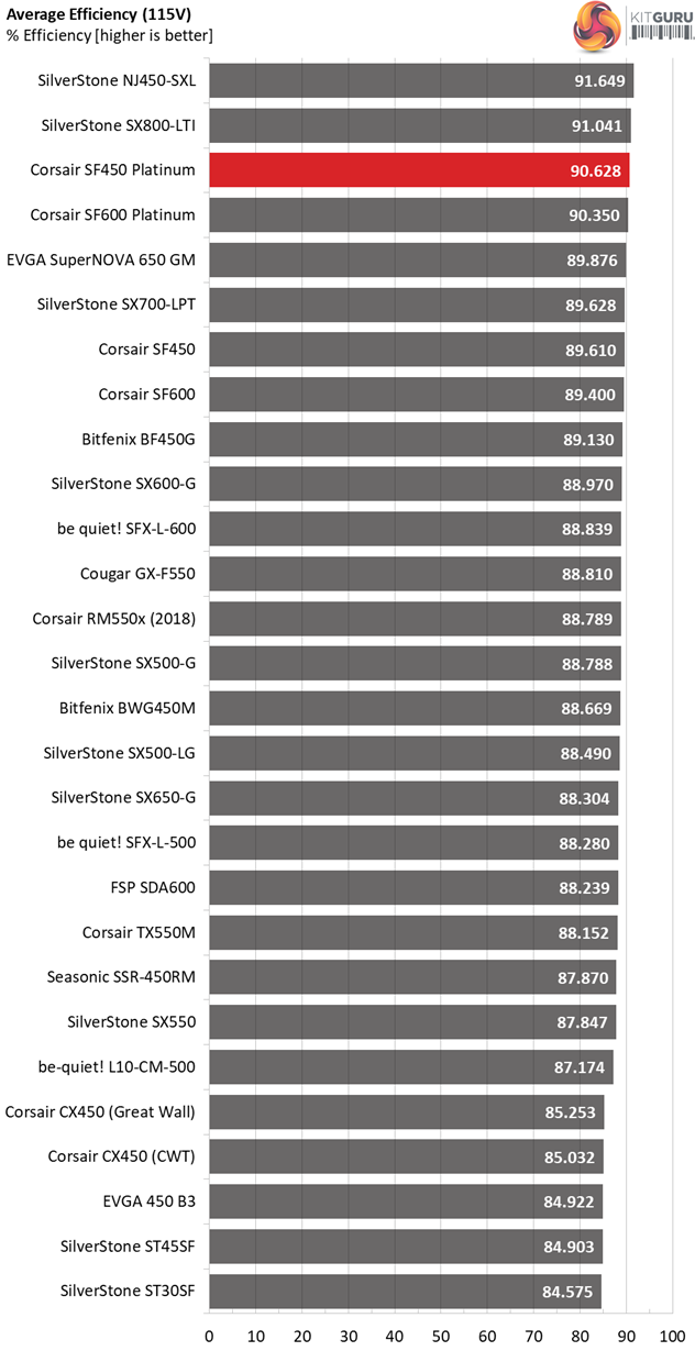 The SF450 Platinum is very close to the requirements of the Cybenetics ETA-A+ standard (>91% overall efficiency), which even a number of 80 PLUS Titanium units fail to meet. With a little more tuning this platform could meet the Titanium requirements, but it would probably had to sacrifice performance in other areas.