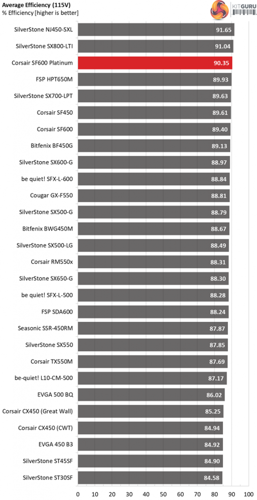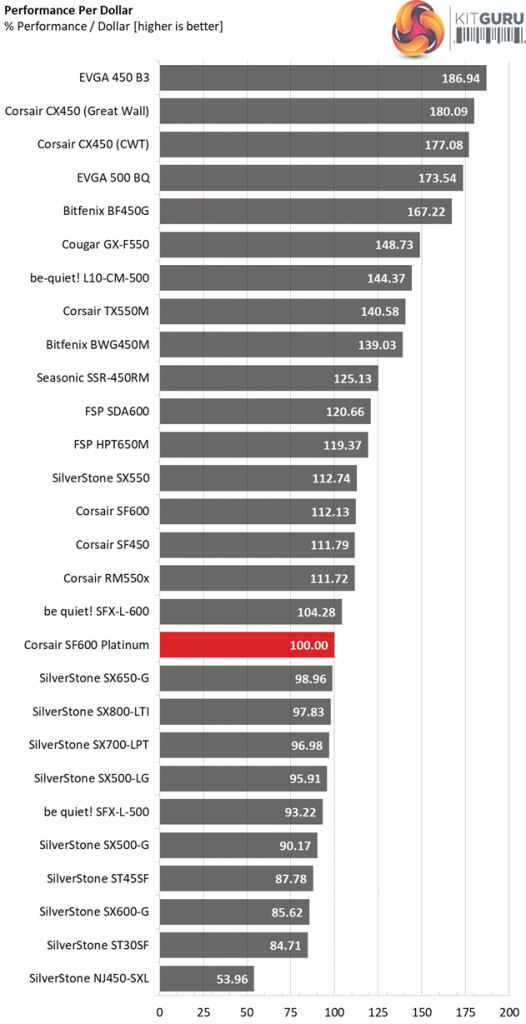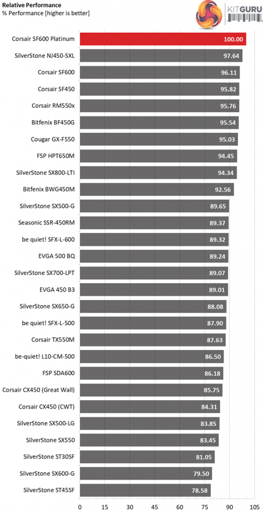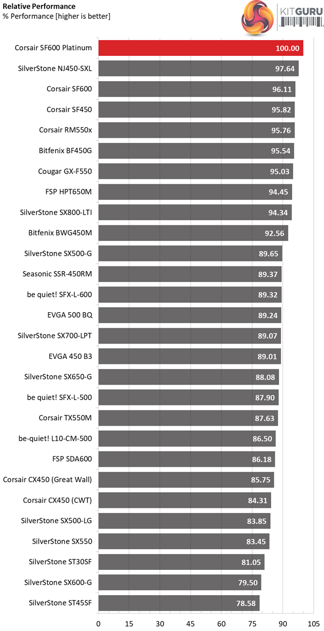 The following graph shows the total performance rating of the SF600 Platinum, comparing it to other units we have tested. To be more specific, the tested unit is shown as 100 percent, and every other unit's performance is shown relative to it.