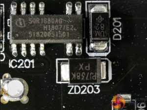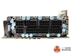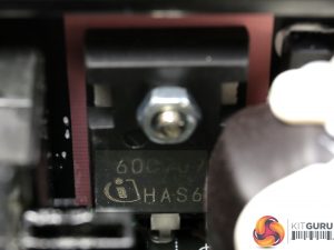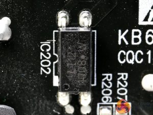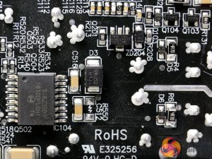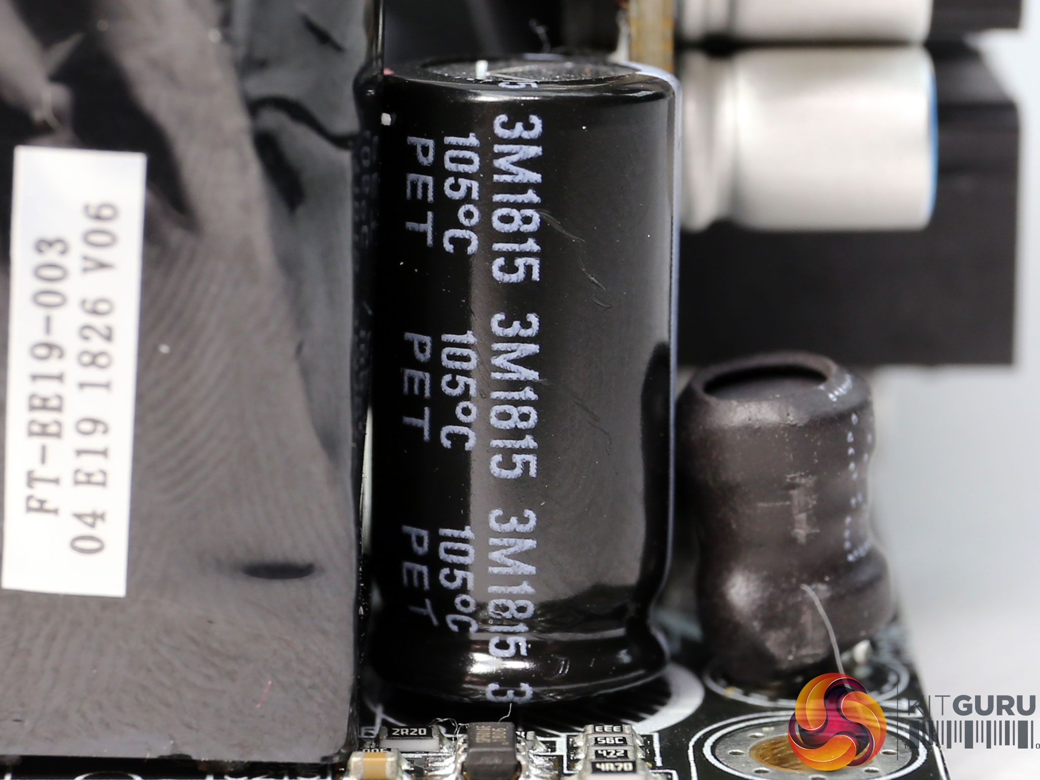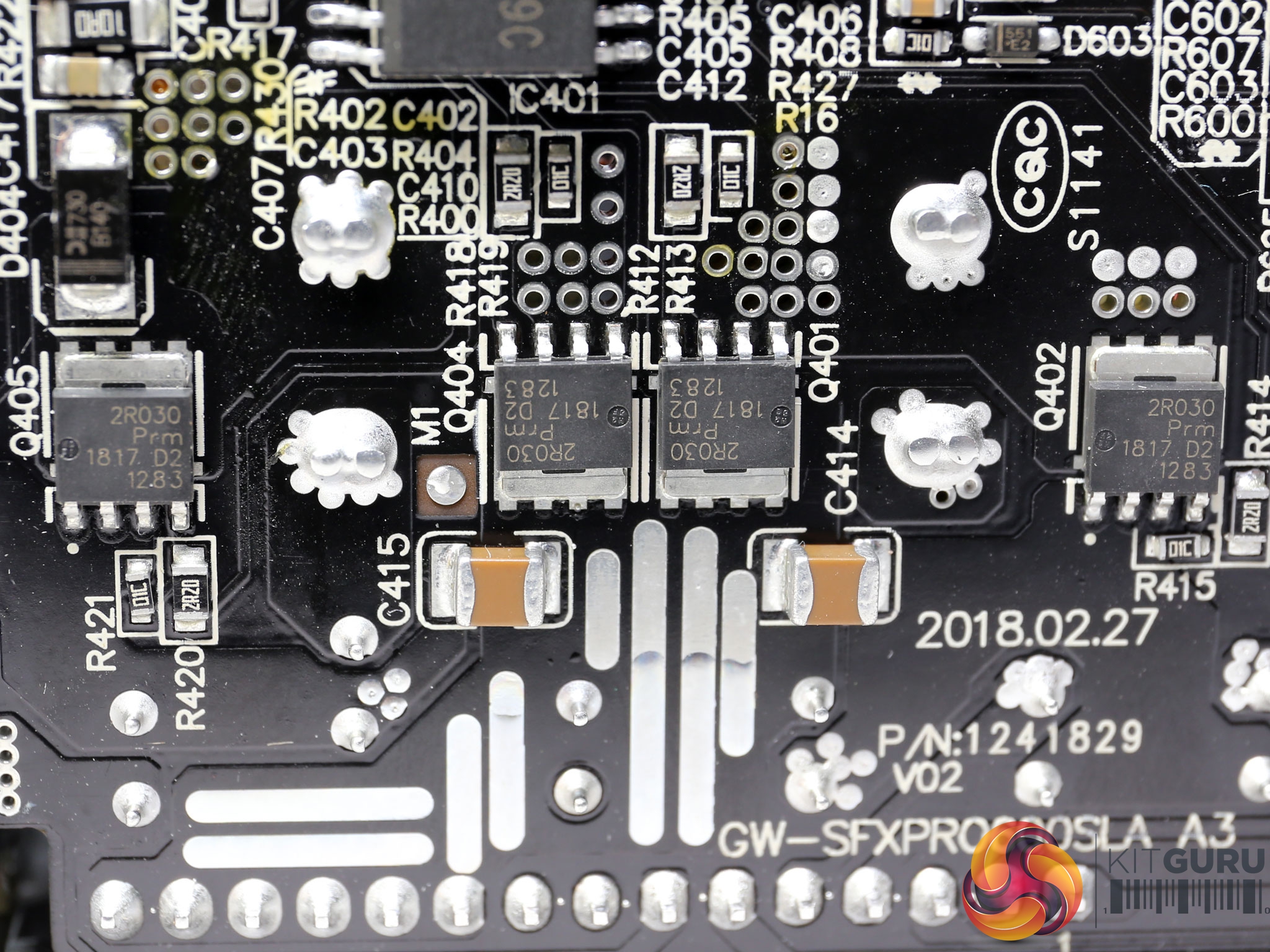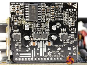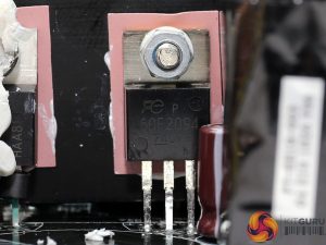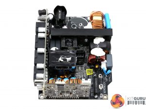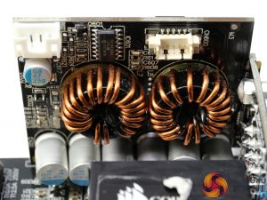 In the primary side Infineon FETs are used and the medium capacity bulk cap is provided by Chemi-Con, while in the secondary side the +12V FETs are installed on the solder side of the main PCB. Typically a pair of DC-DC converters handle the minor rails and the 5VSB rail uses an advanced PWM controller, for high efficiency and minimized vampire power levels.