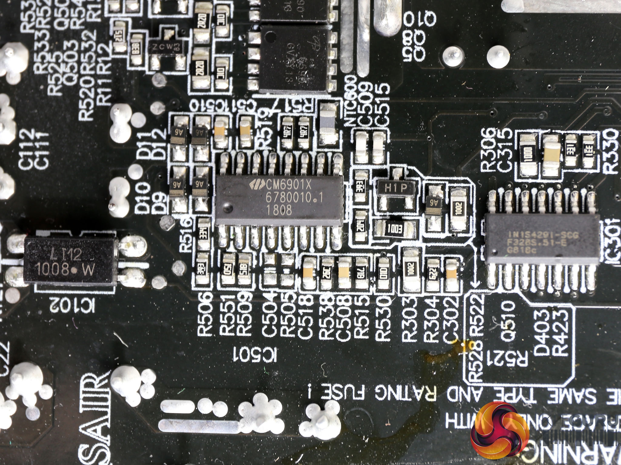Four Alpha & Omega AON6590 FETs regulate the minor rails. The SF600 Gold uses six of those FETs in the same stage. Apparently Corsair figured that this is an overkill, so they removed a couple of them, reducing also the manufacturing cost. The IC that drives the primary switching FETs is installed close to the +12V FETs.