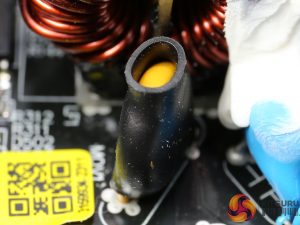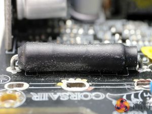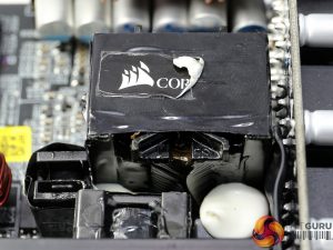 The main transformer. The Corsair sticker is damaged, because we applied a huge thermal load on the entire secondary side with a heat gun, to find the over temperature protection triggering point.