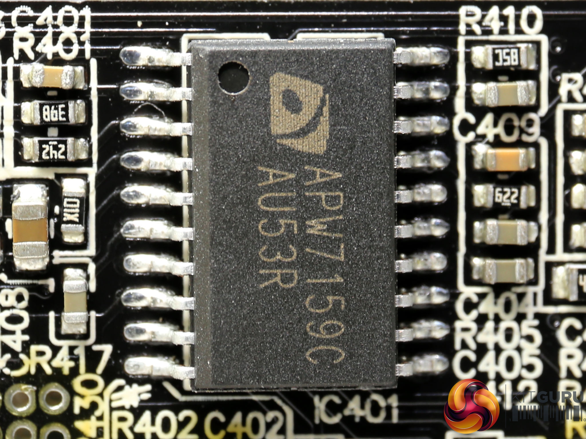 The unit's DC-DC converters use four Nexperia PSMN2R0-30YL FETs and the common PWM controller is a Anpec APW7159C.
