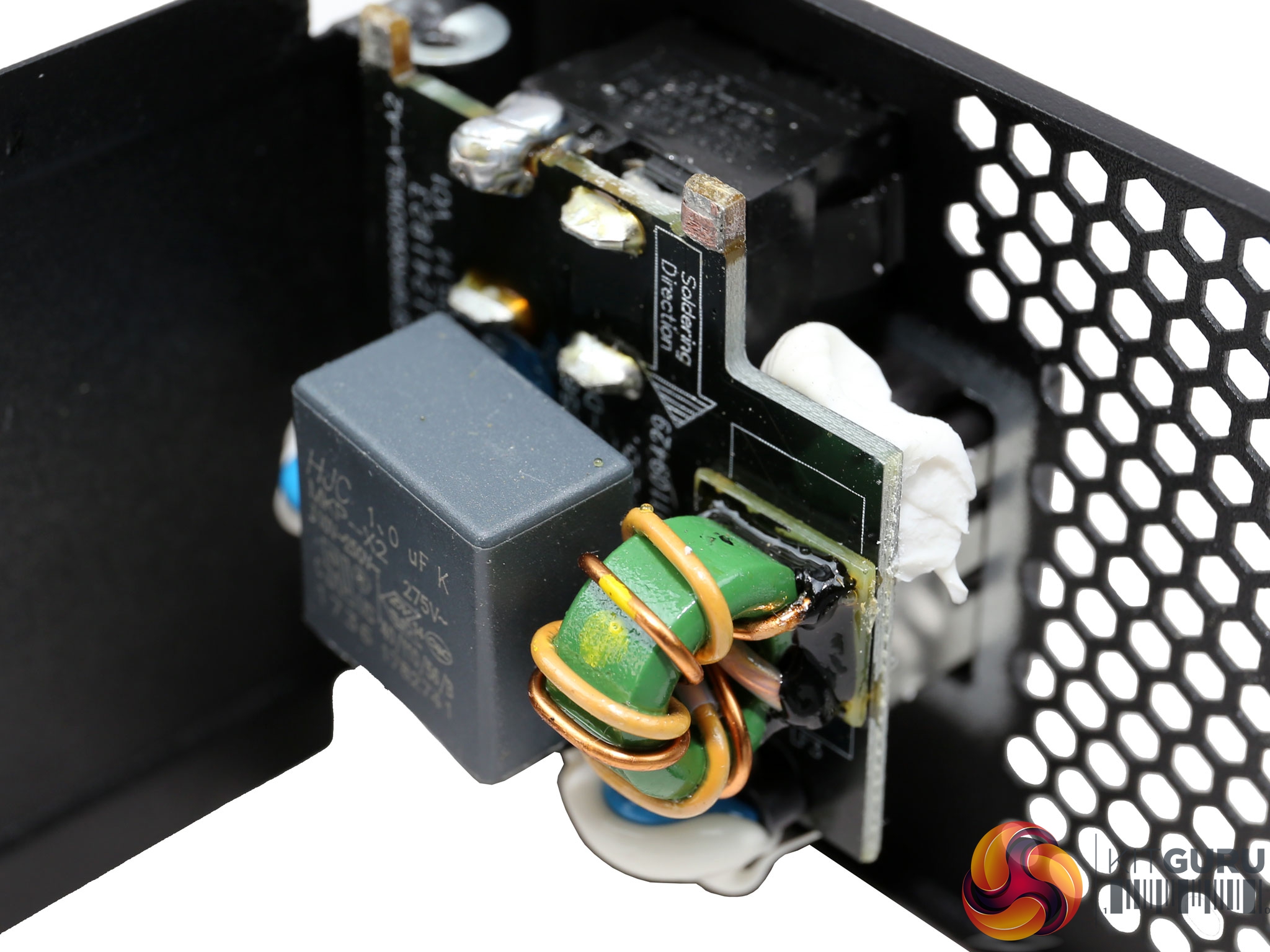 The first part of the transient filter is hosted on a small PCB, located right behind the AC receptacle. It consists of two Y and one X caps. There is also a small CM choke there.